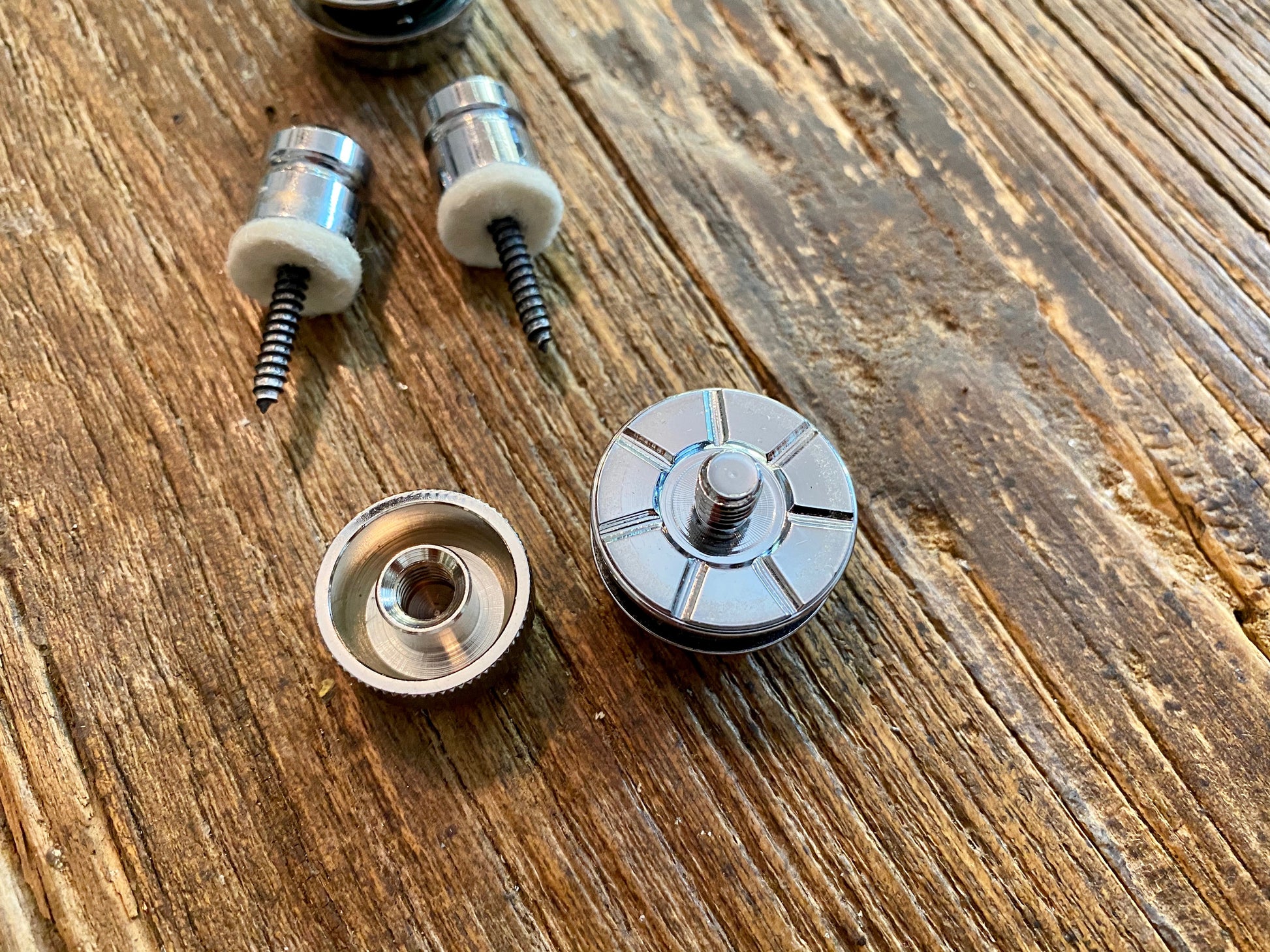 Here's a nice and clean set of genuine Fender "F" Logo strap locks. Comes complete with buttons, screws, and even the felt pads.