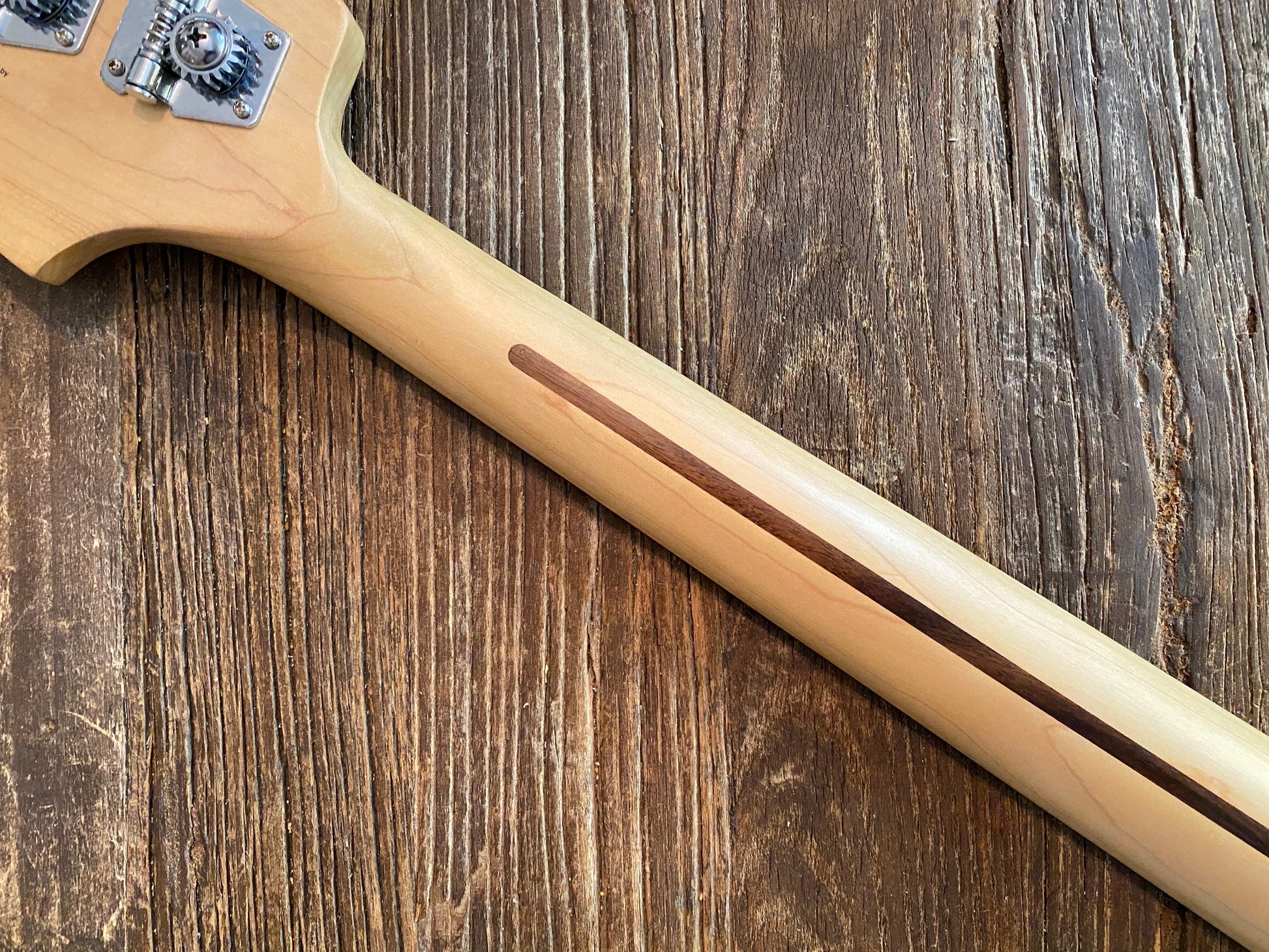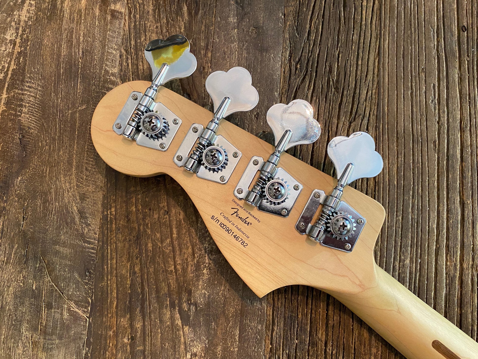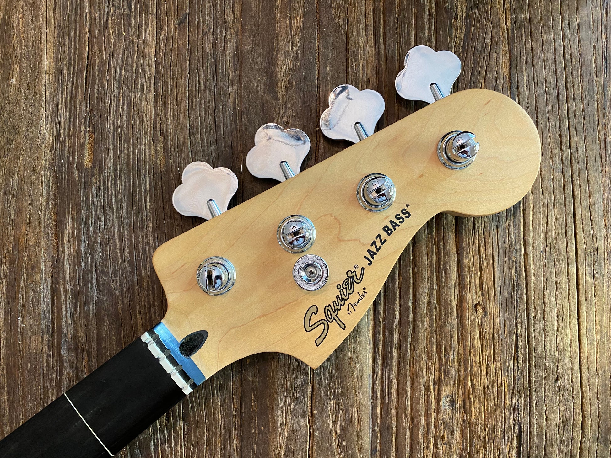 Here's a super nice and clean 2009 Squier by Fender Vintage Modified Jazz Bass neck complete with the original open gear style tuning machines. The satin finish on the maple has a fantastic feel and is extremely comfortable. The Ebonol fretboard has a fantastic finish and feel. Really great overall condition with the only minor exception of the tiniest sliver of the inlayed fret insert is missing from the final fret. Still feels great and has striking appearance. This could be the the perfect piece to finish off your next project.