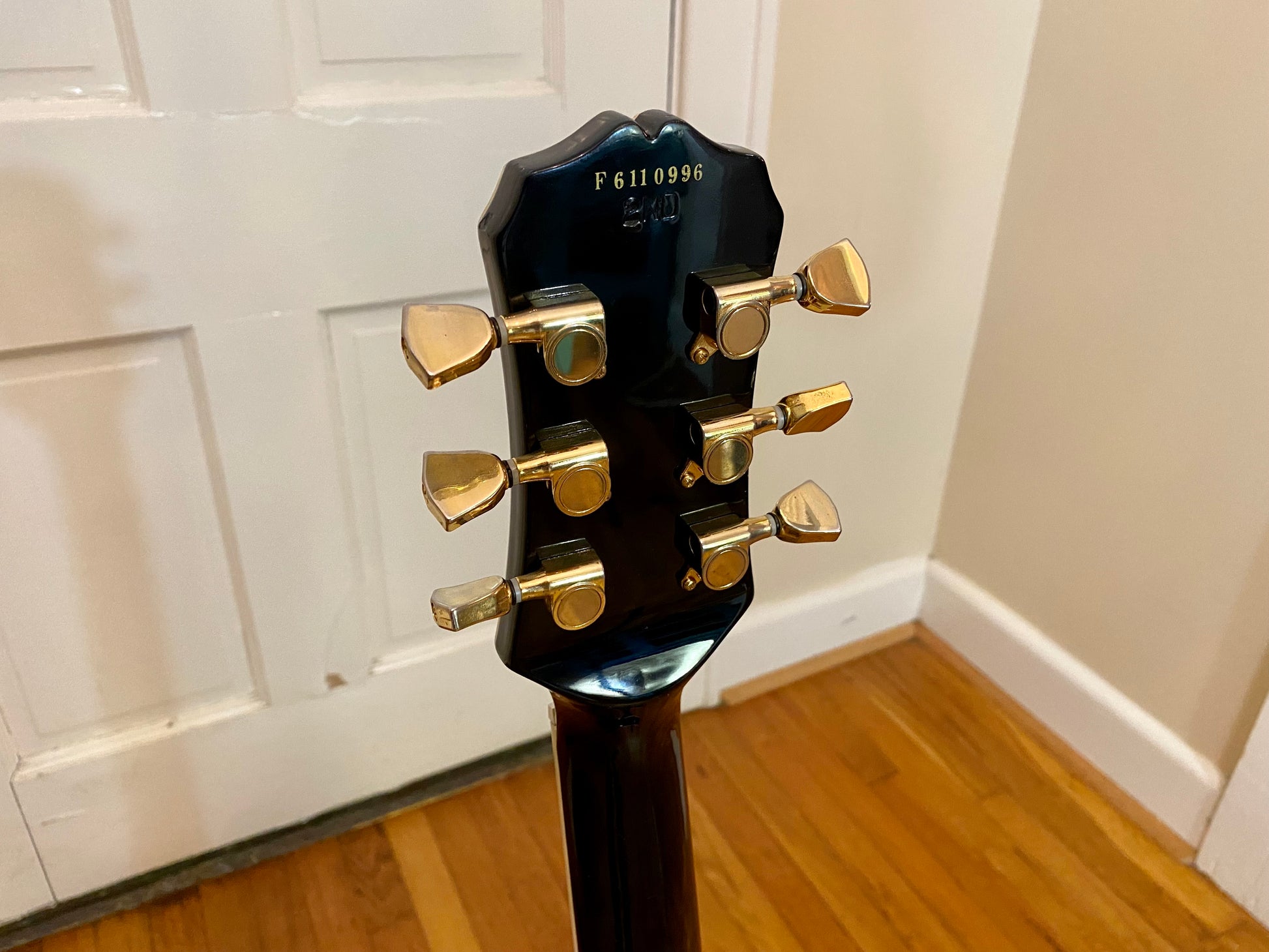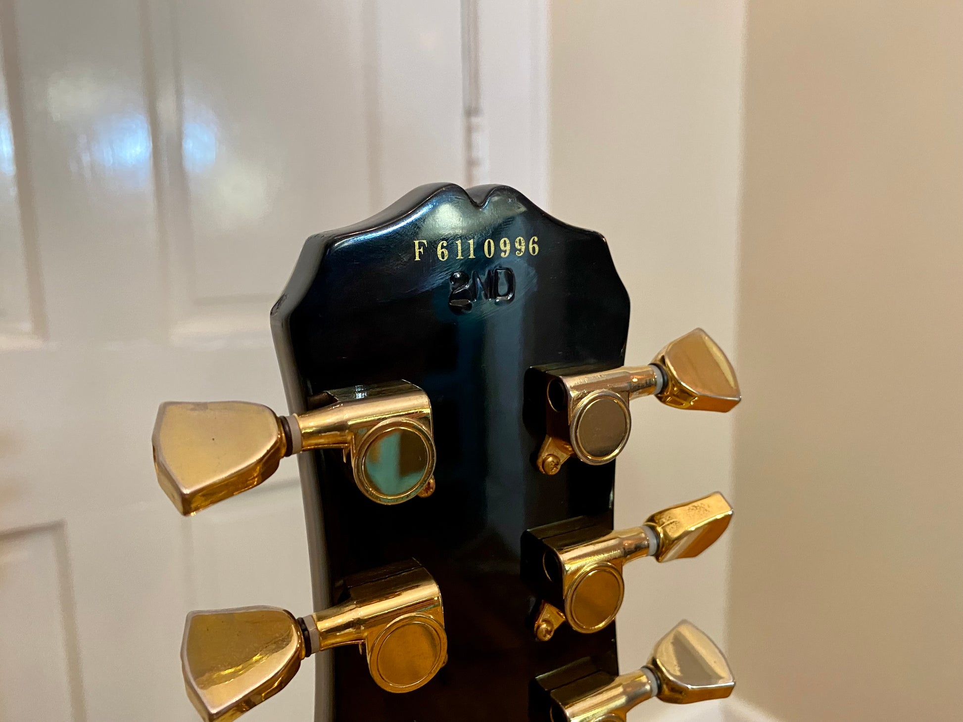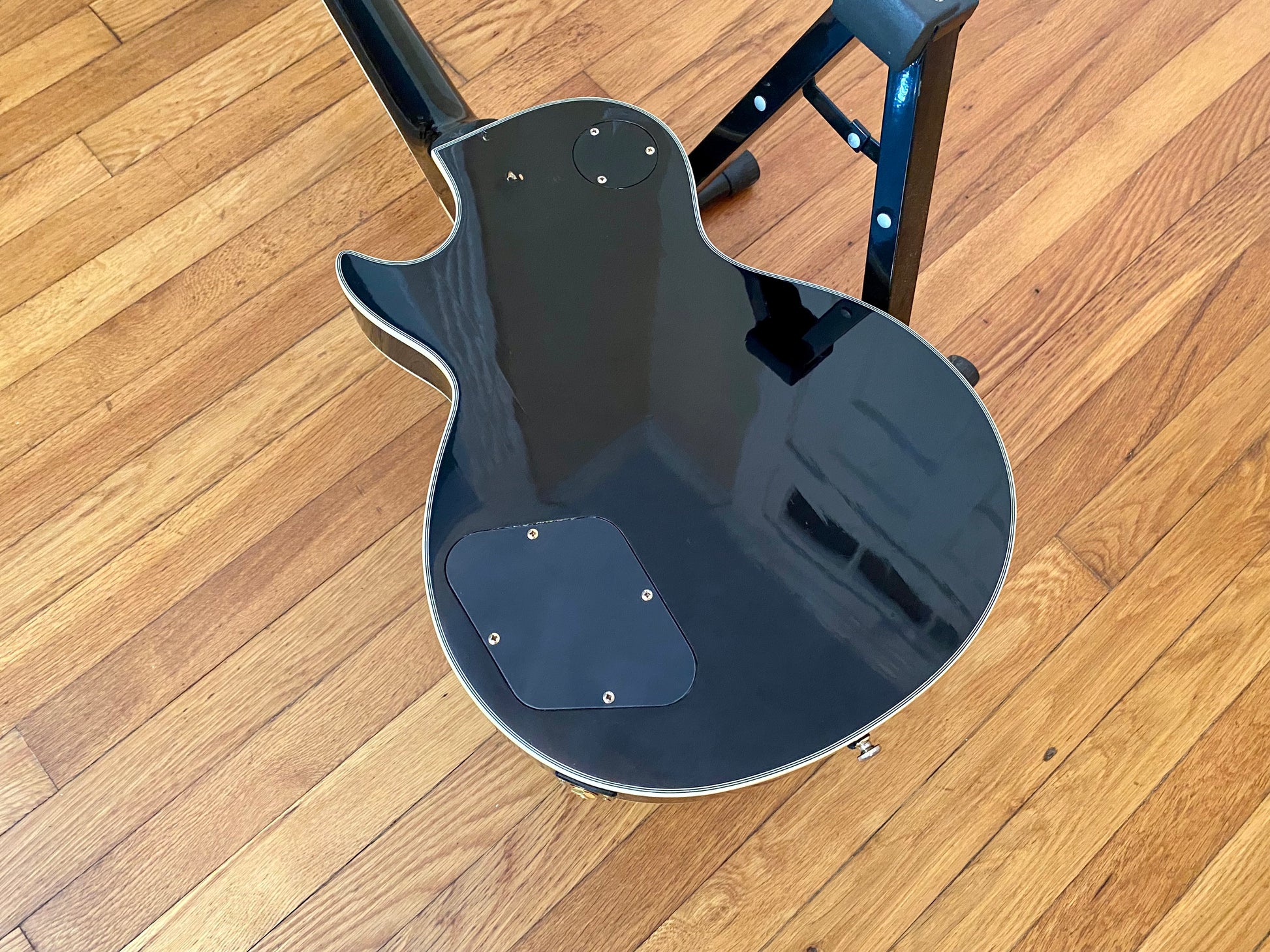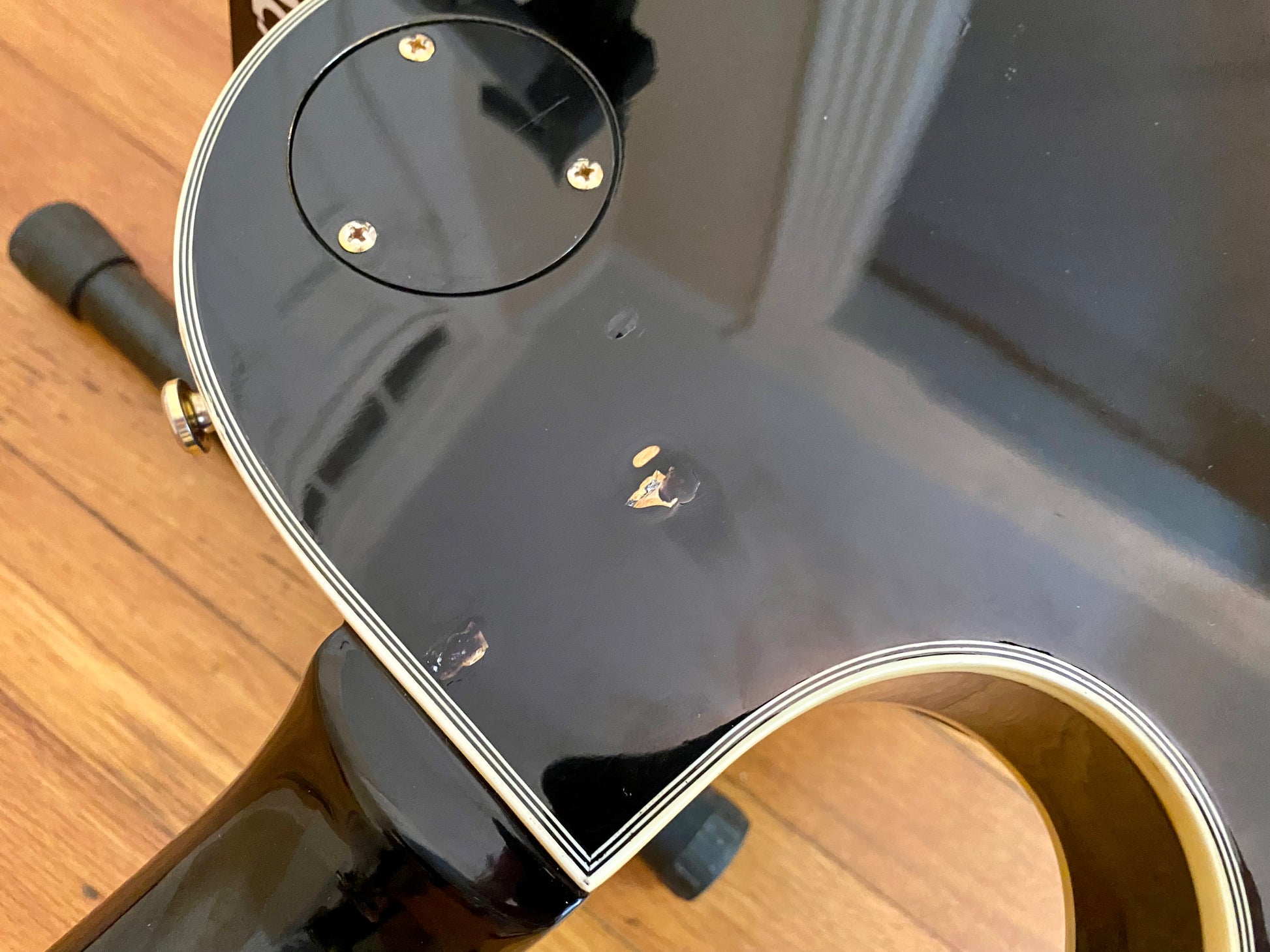 This guitar is stamped "2nd" for an unknown factory flaw. The top is in great shape overall for a 25 year old guitar showing only very minor light surface scratches - black does show everything. The back looks similar with the addition to a few dings were the pain was broken that have been touched up with an unknown finish - still visible but no longer exposed.