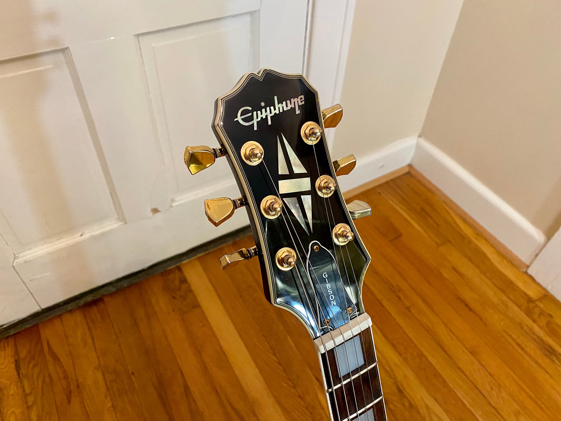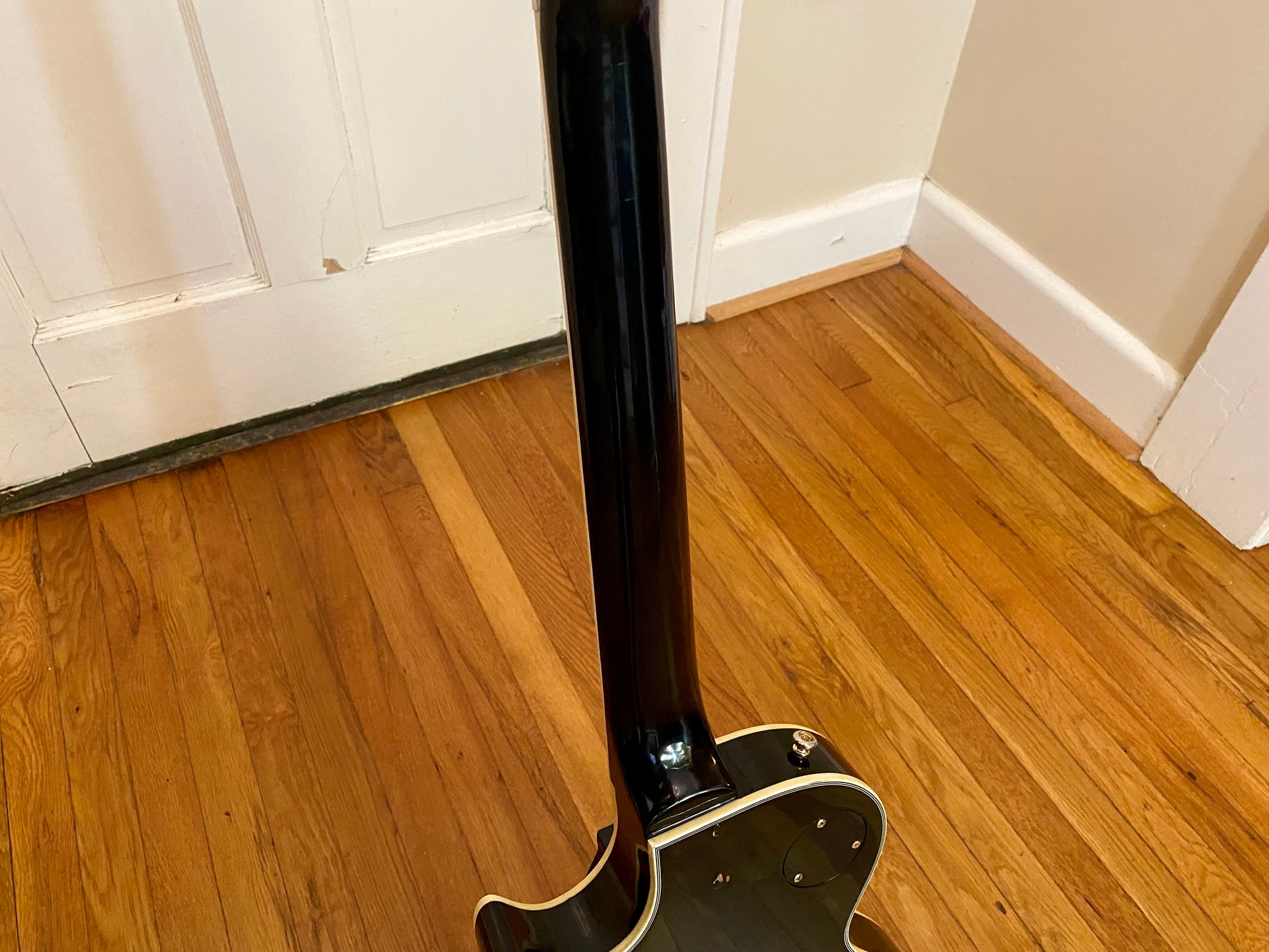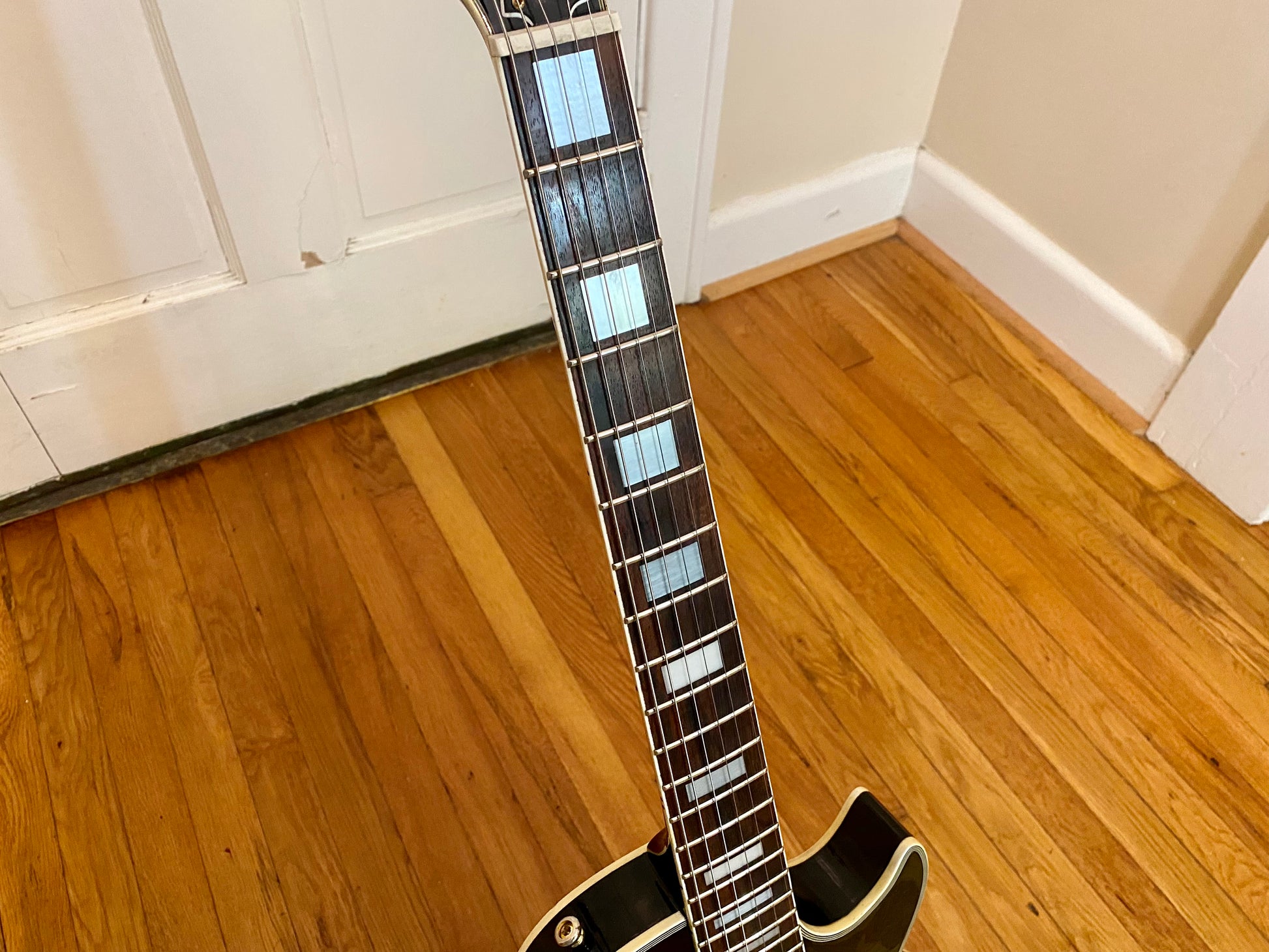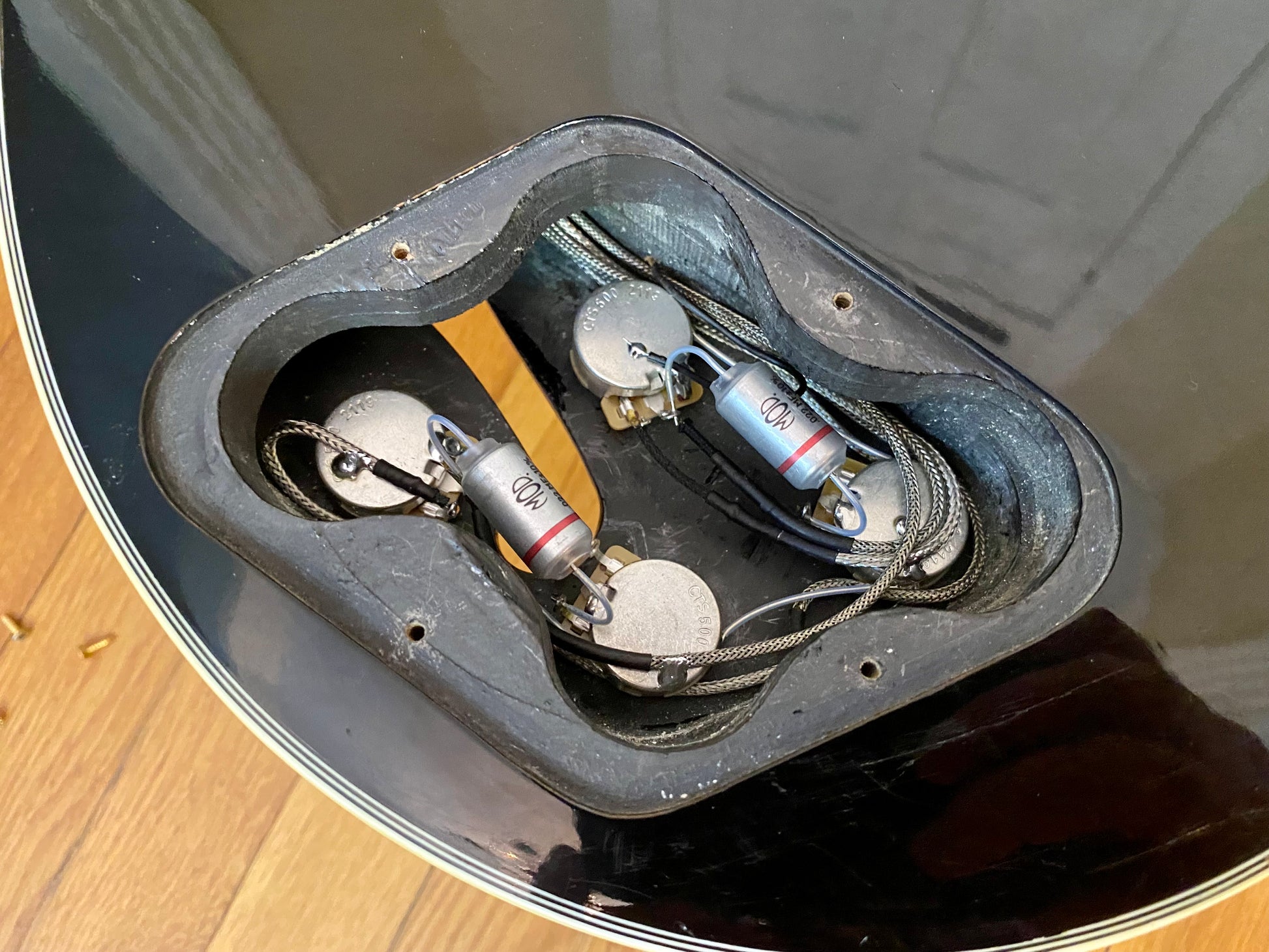 The electronics have been completely overhauled with a fresh set of Golden Age Parsons Street AlNiCo V humbuckers, CTS 550 kΩ Custom Audio Taper Pots with MOD Oil-filled capacitors. The toggle is a gold Switchcraft standard/tall frame toggle found in most Gibsons along with a matching gold Switchcraft #11 output jack. All wired up with vintage style braided shield pushback wire.