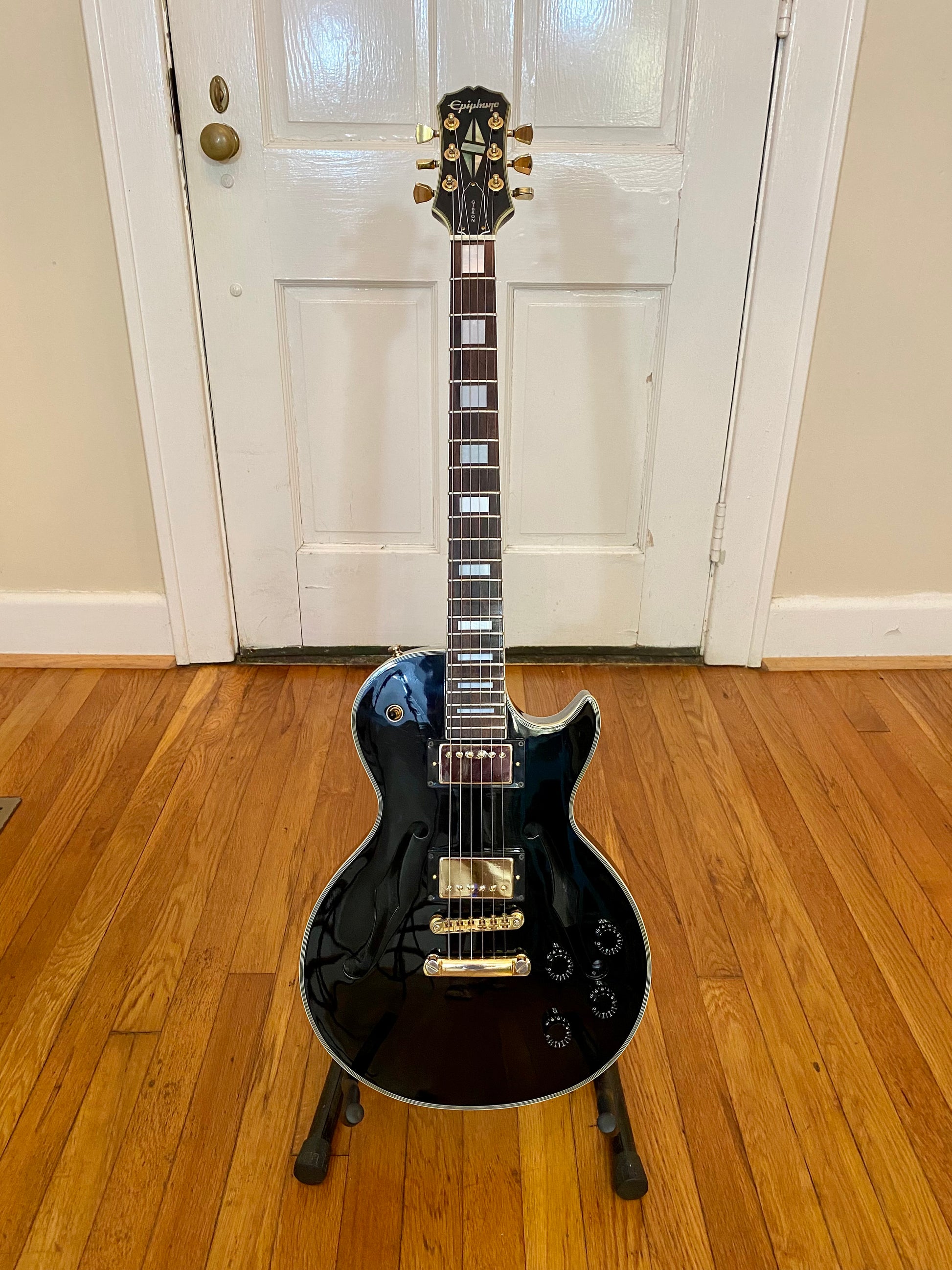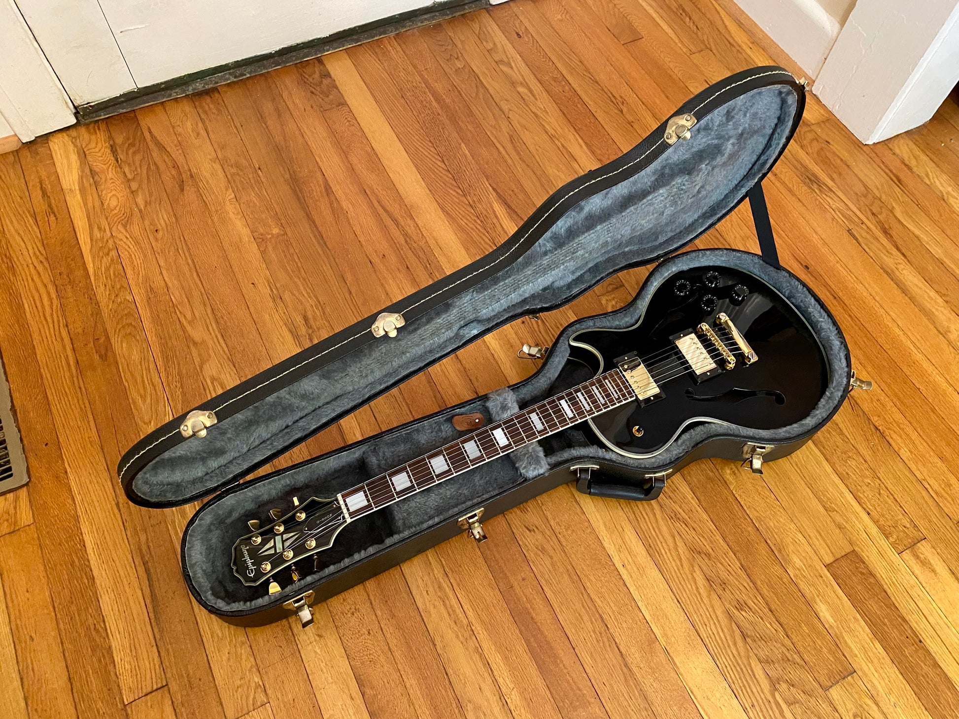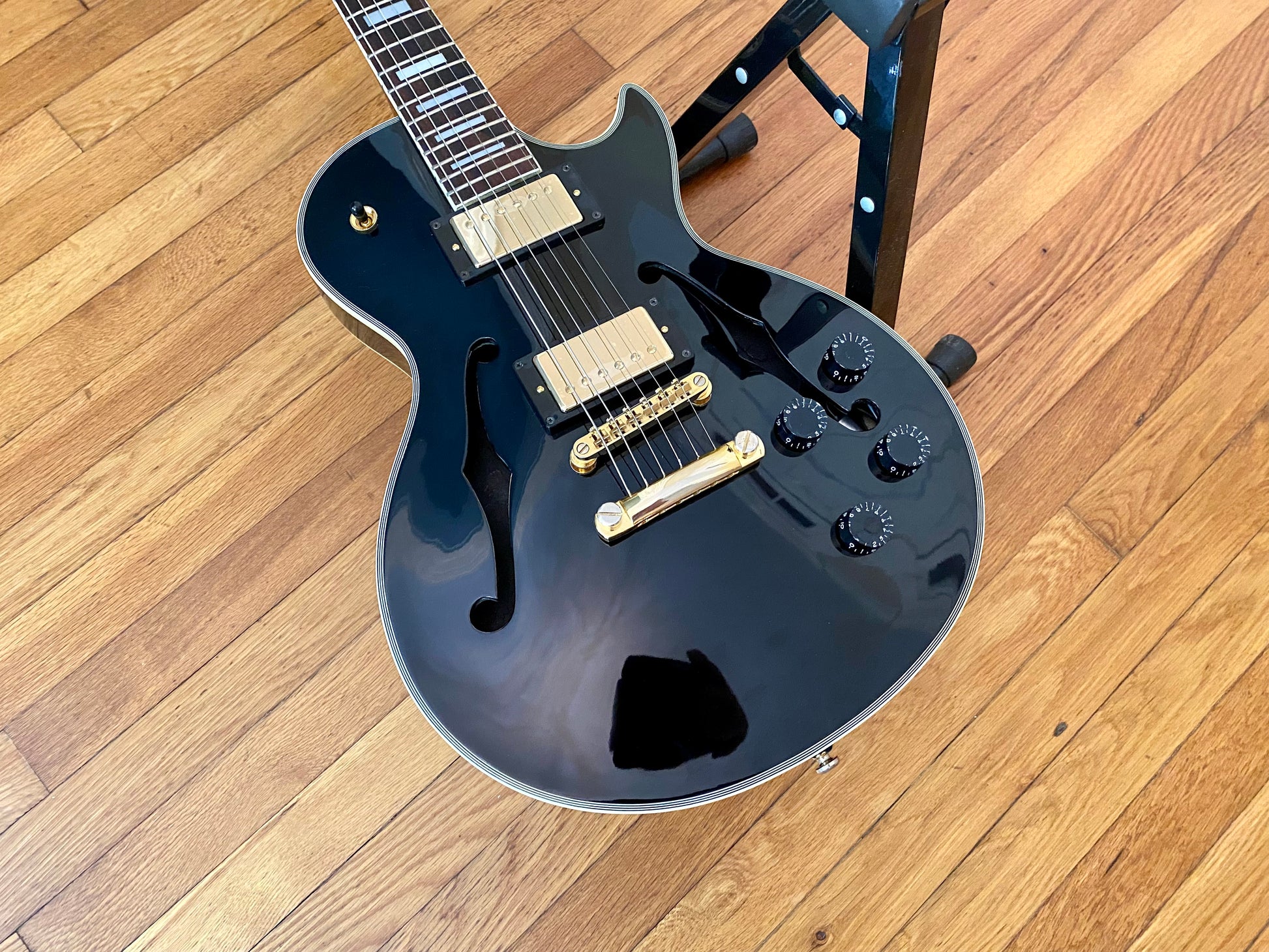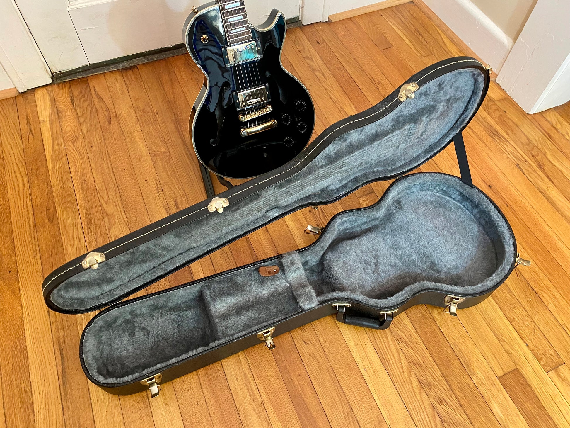 The electronics have been completely overhauled with a fresh set of Golden Age Parsons Street AlNiCo V humbuckers, CTS 550 kΩ Custom Audio Taper Pots with MOD Oil-filled capacitors. The toggle is a gold Switchcraft standard/tall frame toggle found in most Gibsons along with a matching gold Switchcraft #11 output jack. All wired up with vintage style braided shield pushback wire.