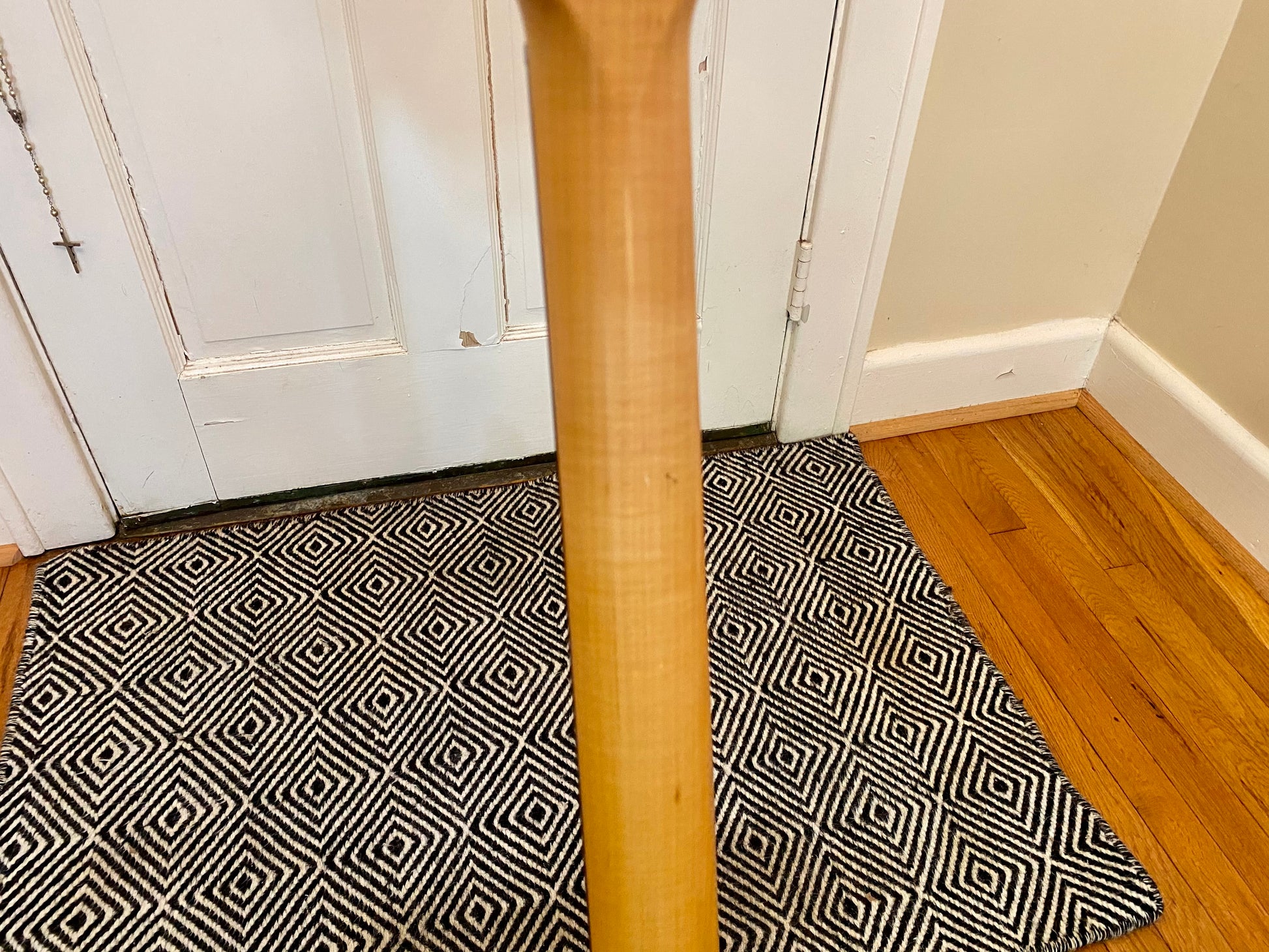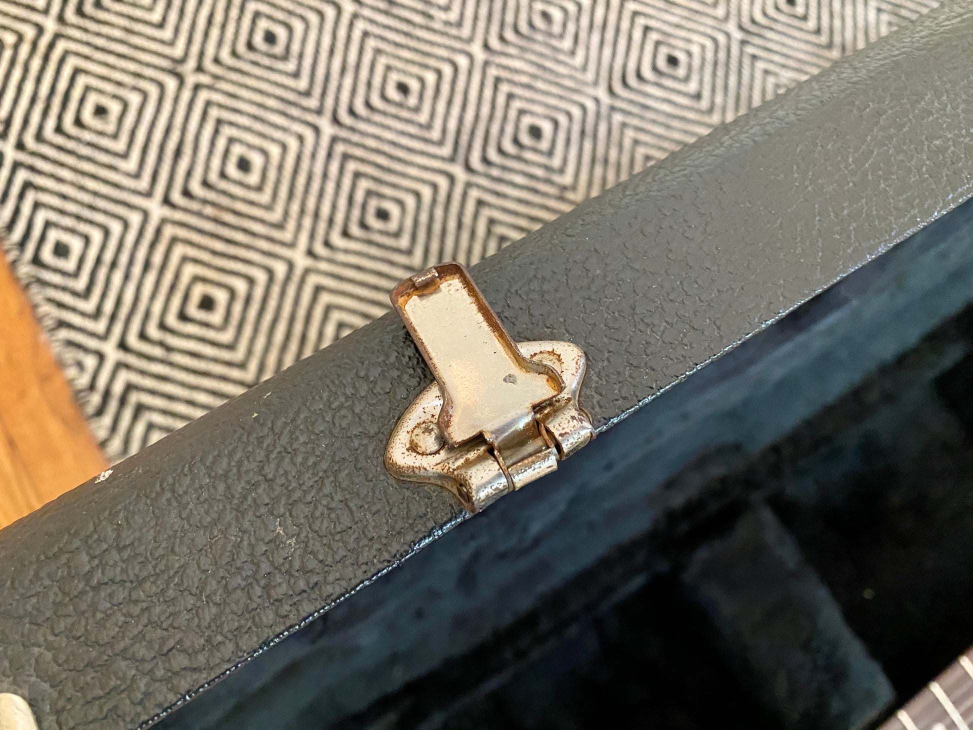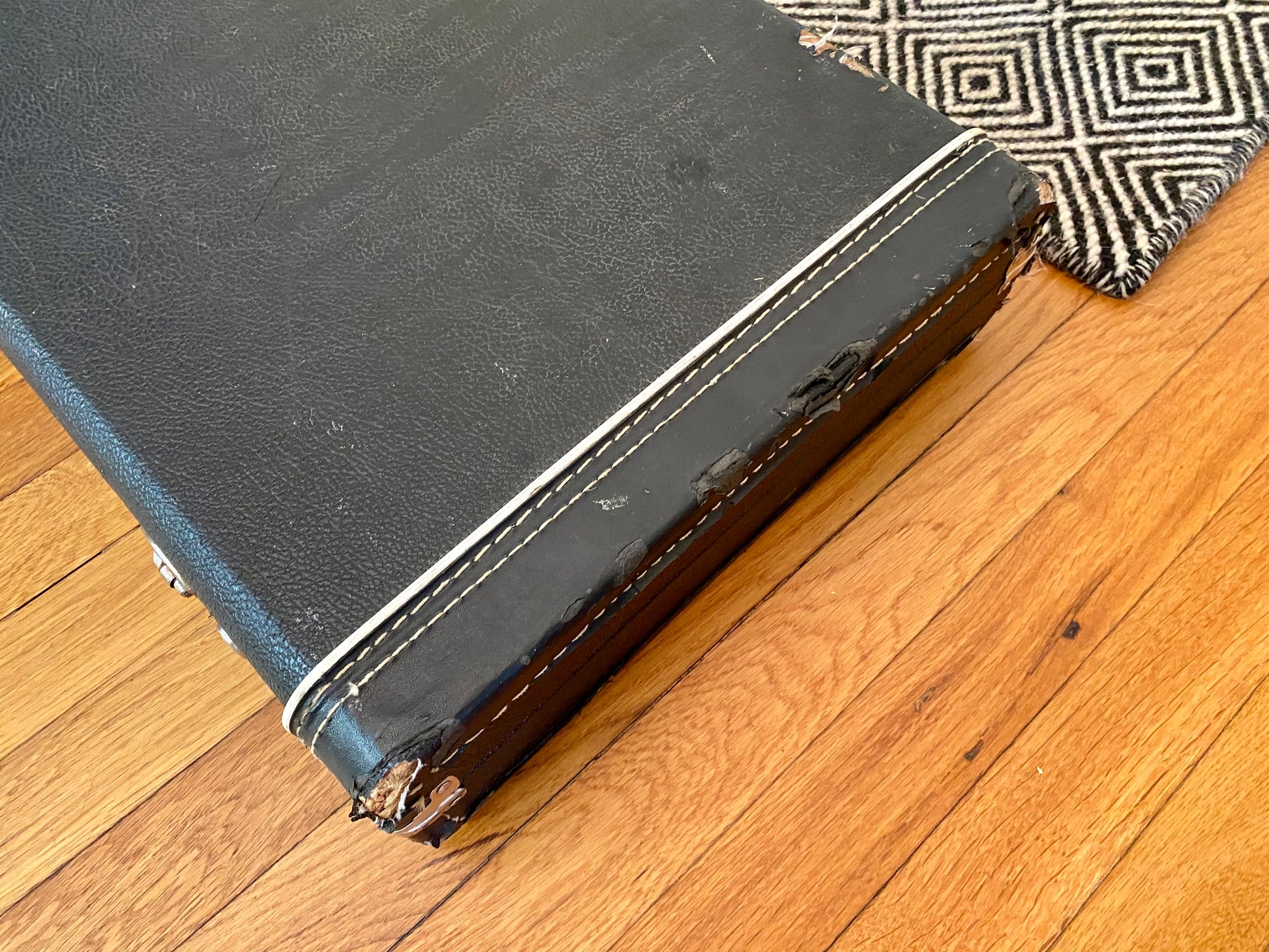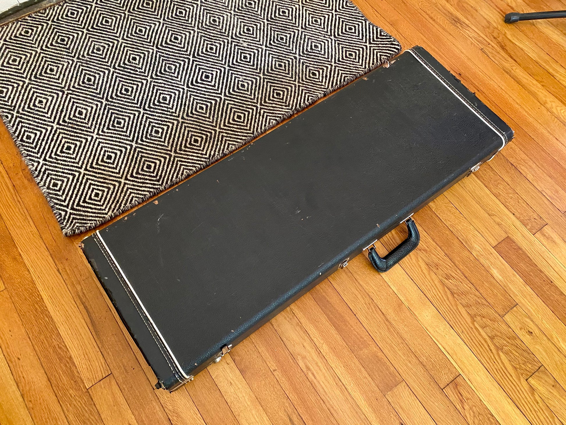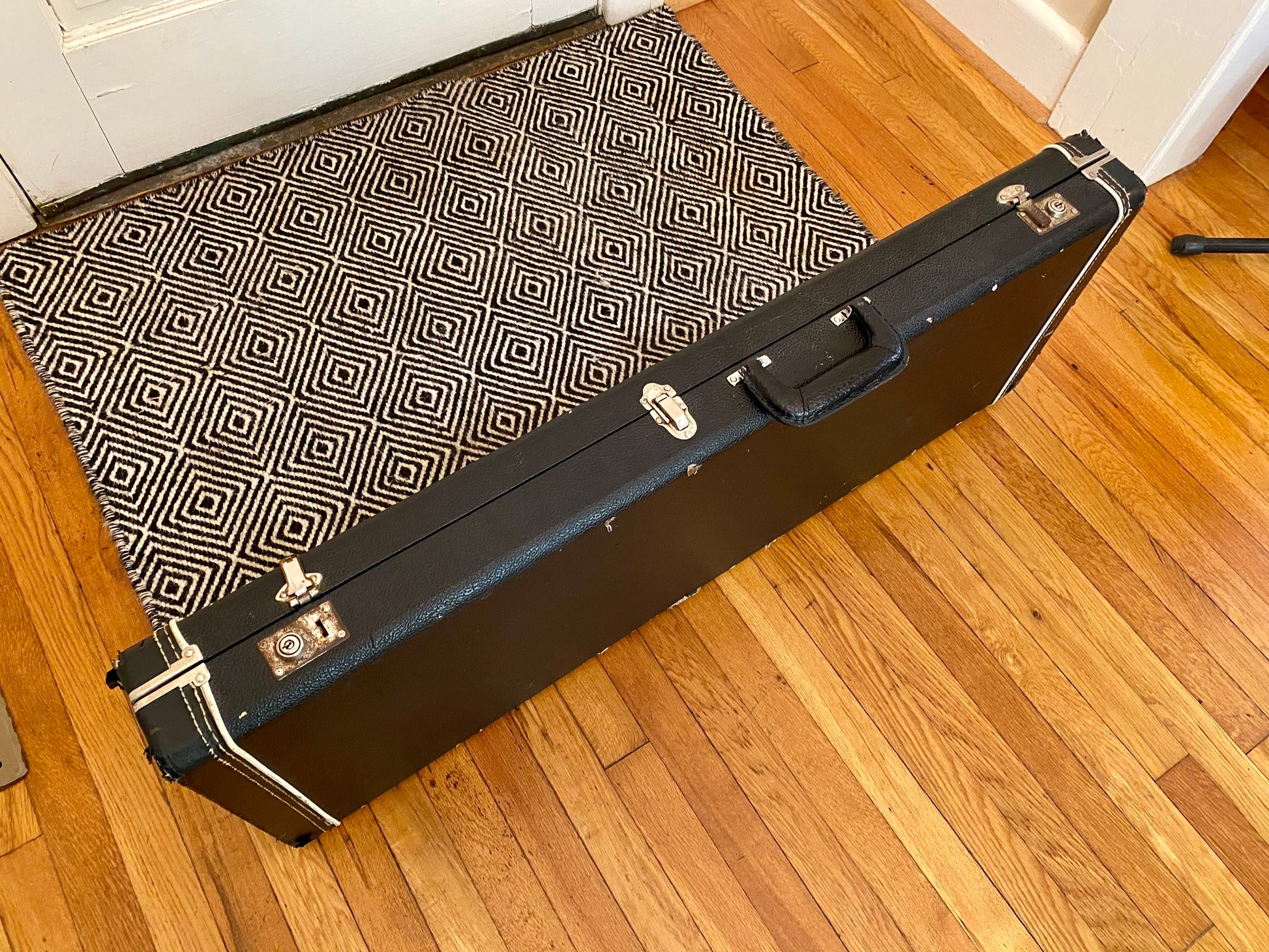 The original hard case does show a fair amount of wear with superficial rips/tears in the tolex. The neck-end case latch is broken and does not close. Unfortunately no case keys, documents, or tremolo arm are available to be included.
