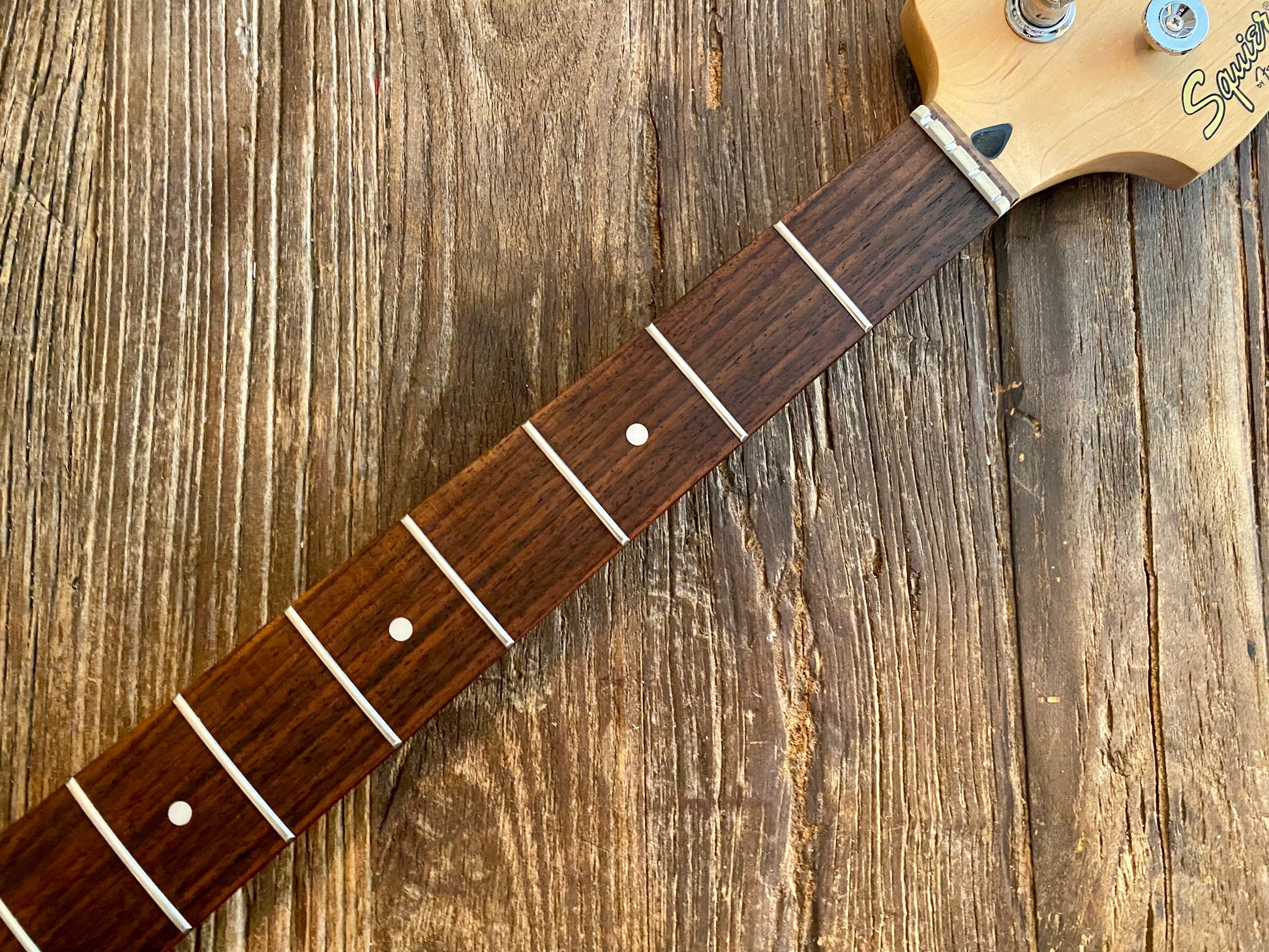 Here's a super nice and clean 2004 Squier by Fender Standard Series Jazz Bass Neck complete with the original open gear tuners. The neck itself is straight and the truss rod functions properly. No notable blemishes outside of very light playing wear. The fretboard and cleaned cleaned and conditioned. The frets have been polished and show virtually zero wear. This could be a great piece to finish off your next bass project.