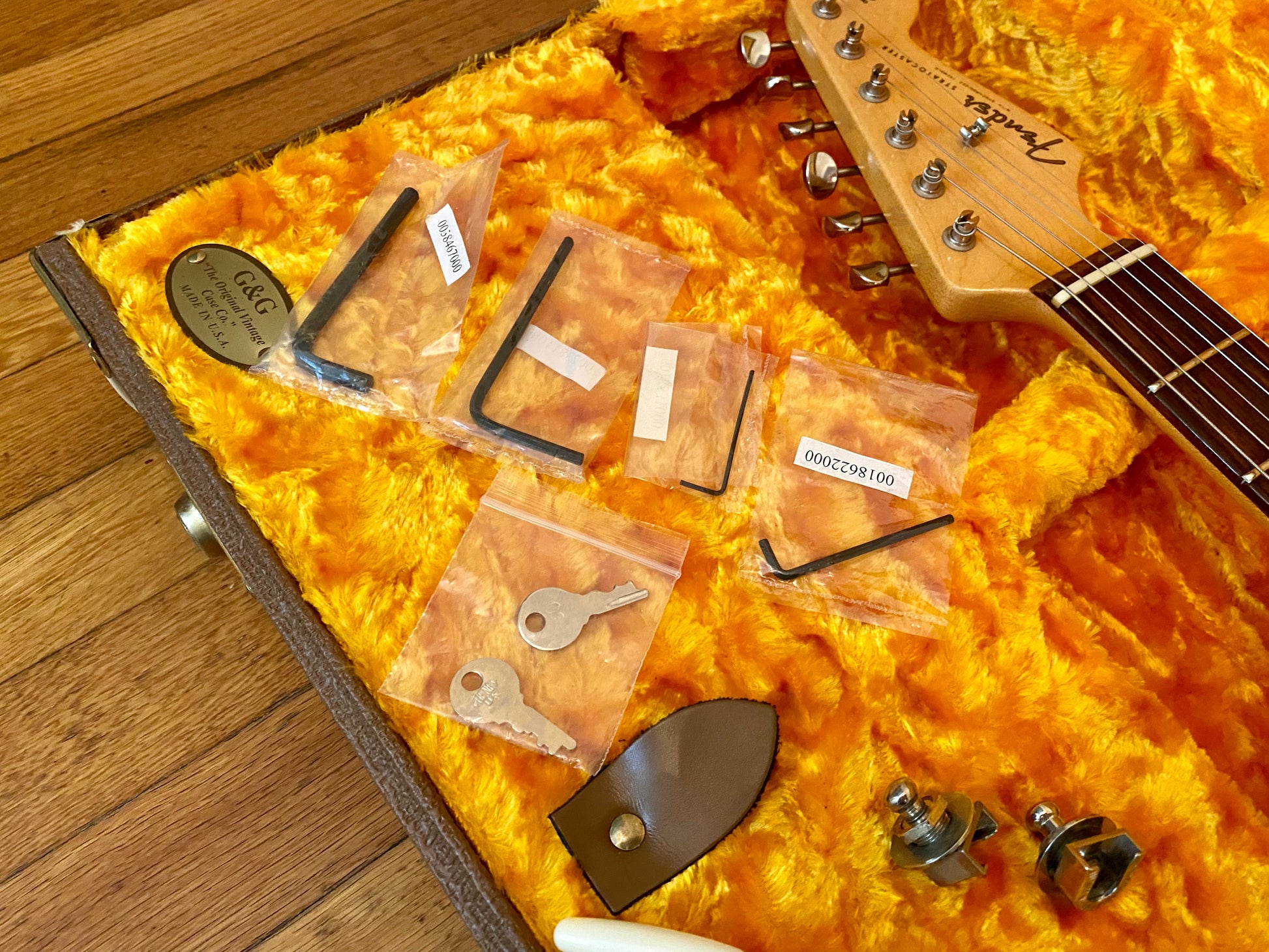 Comes complete with the tremolo arm, bridge cover, all the original literature and case candy. The only notable blemish is a finish crack that is barely noticeable underneath the neck plate. It'd be tough to ask for a nicer, more unique Strat.