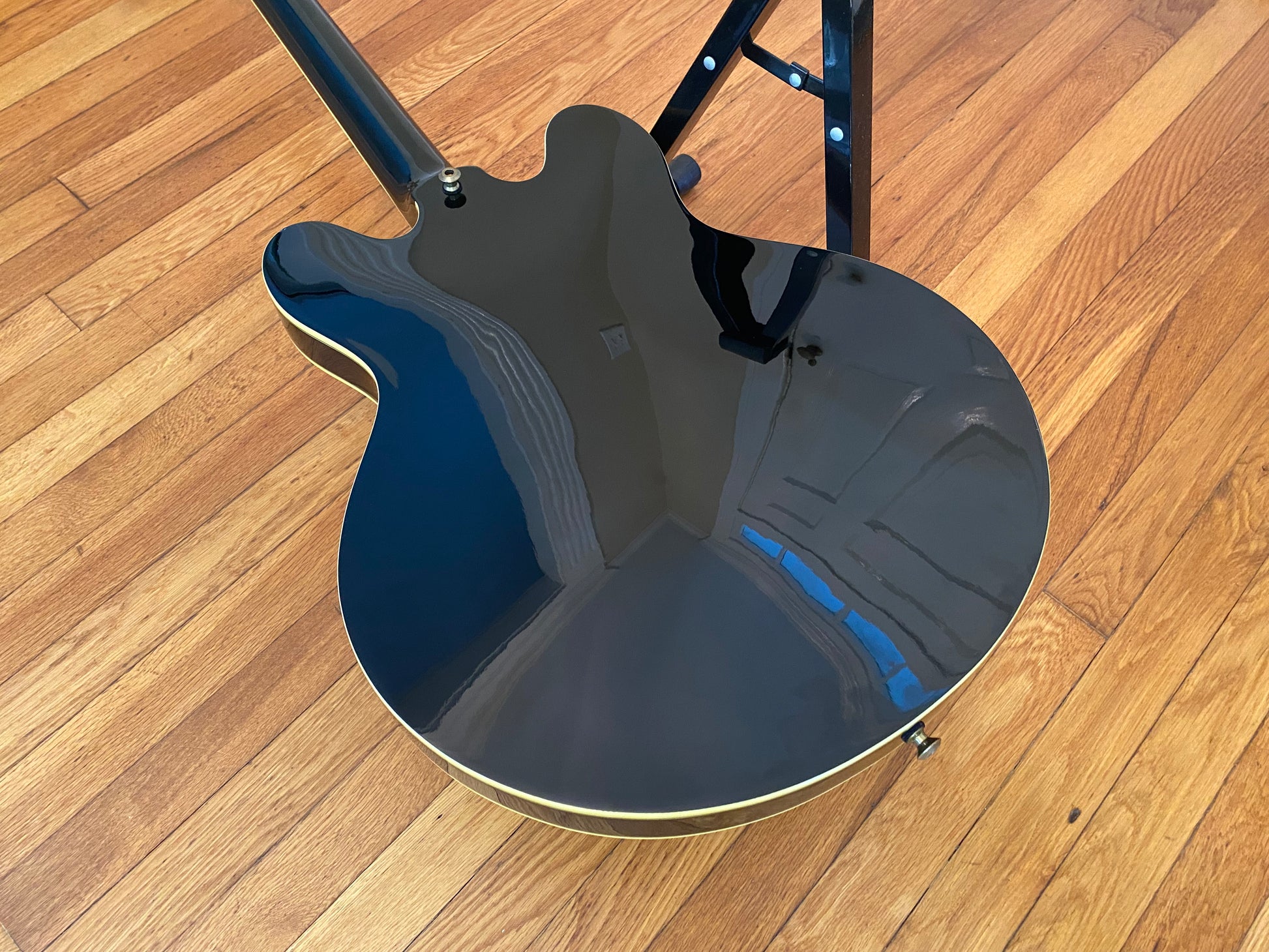 Here's an extremely nice and clean 2006 Epiphone Sheraton II. All original throughout (except for Dunlop style Strap Locks) and showing virtually zero wear on the body and for a black guitar that is something to be proud of. The hardware is showing signs of a light patina, more so on the pickup covers.