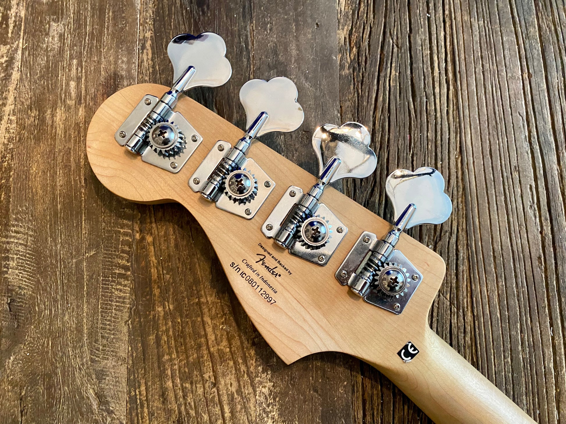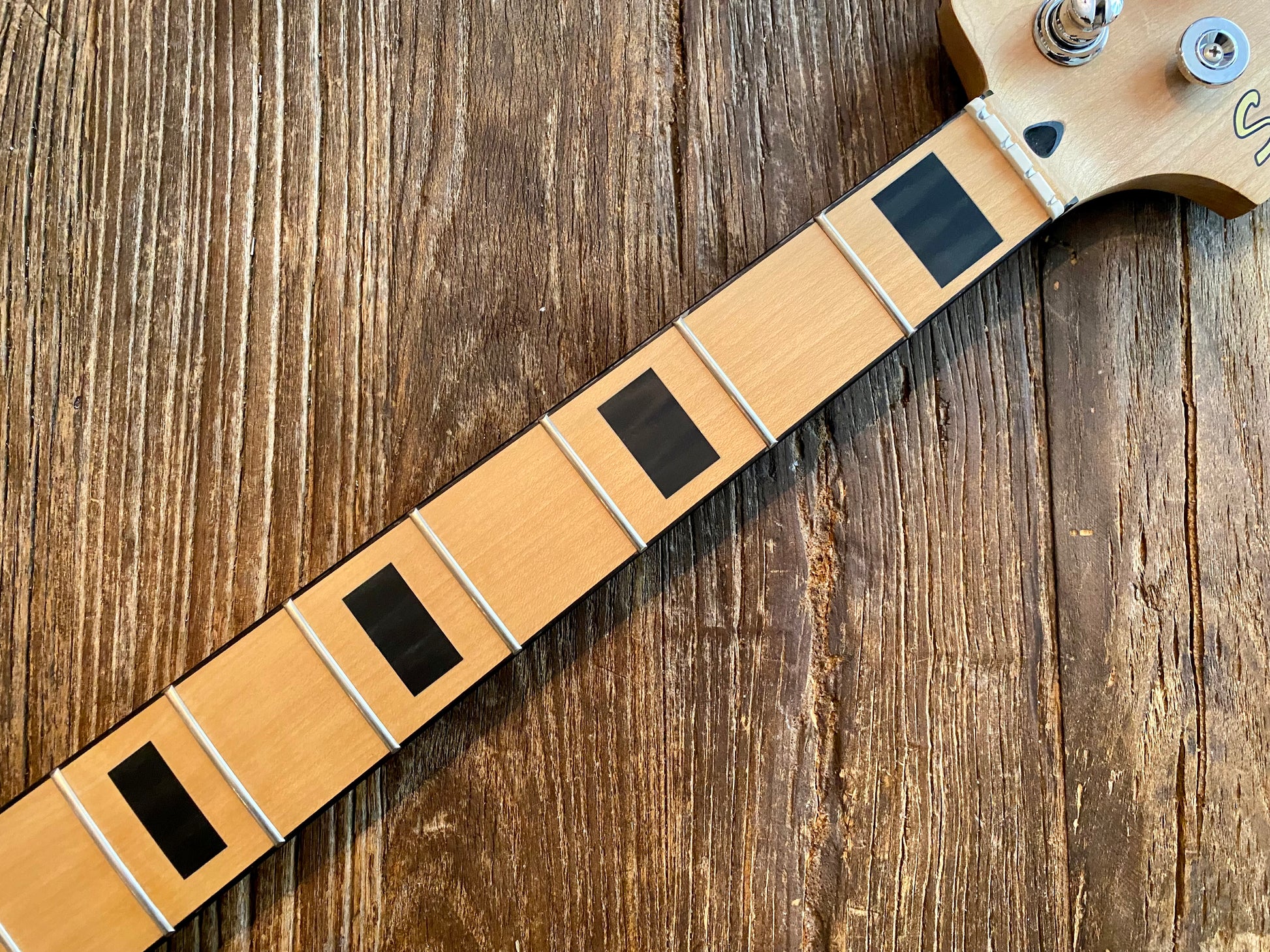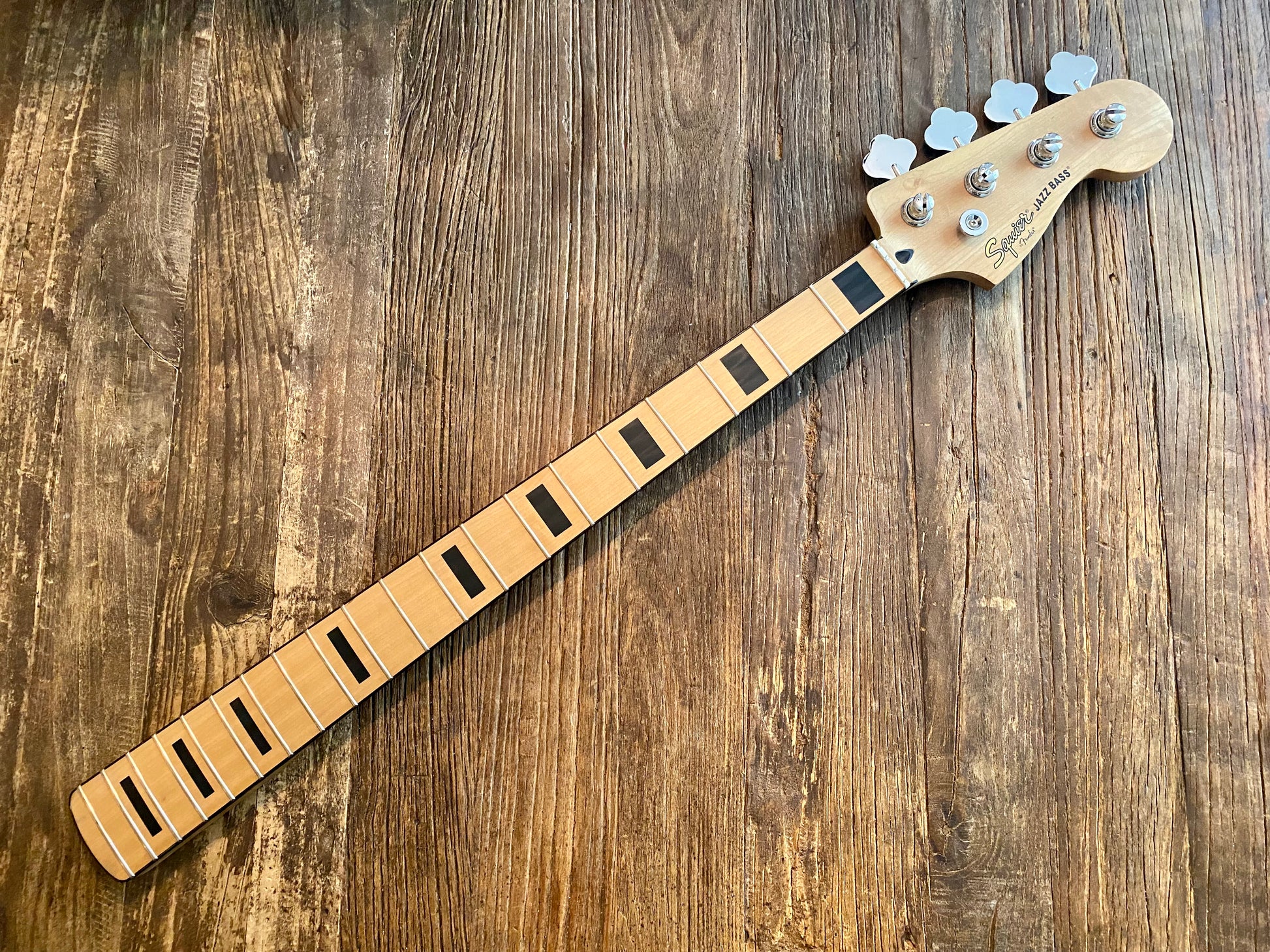 Here's a super nice and clean 2008 Squier by Fender Vintage Modified Jazz Bass neck complete with the original tuning machines and unique black block inlays. The satin finish feels fantastic and the frets are in great shape showing very little wear. There is one small ding behind the 10th fret that has been clearly pictured. Otherwise no notable wear.