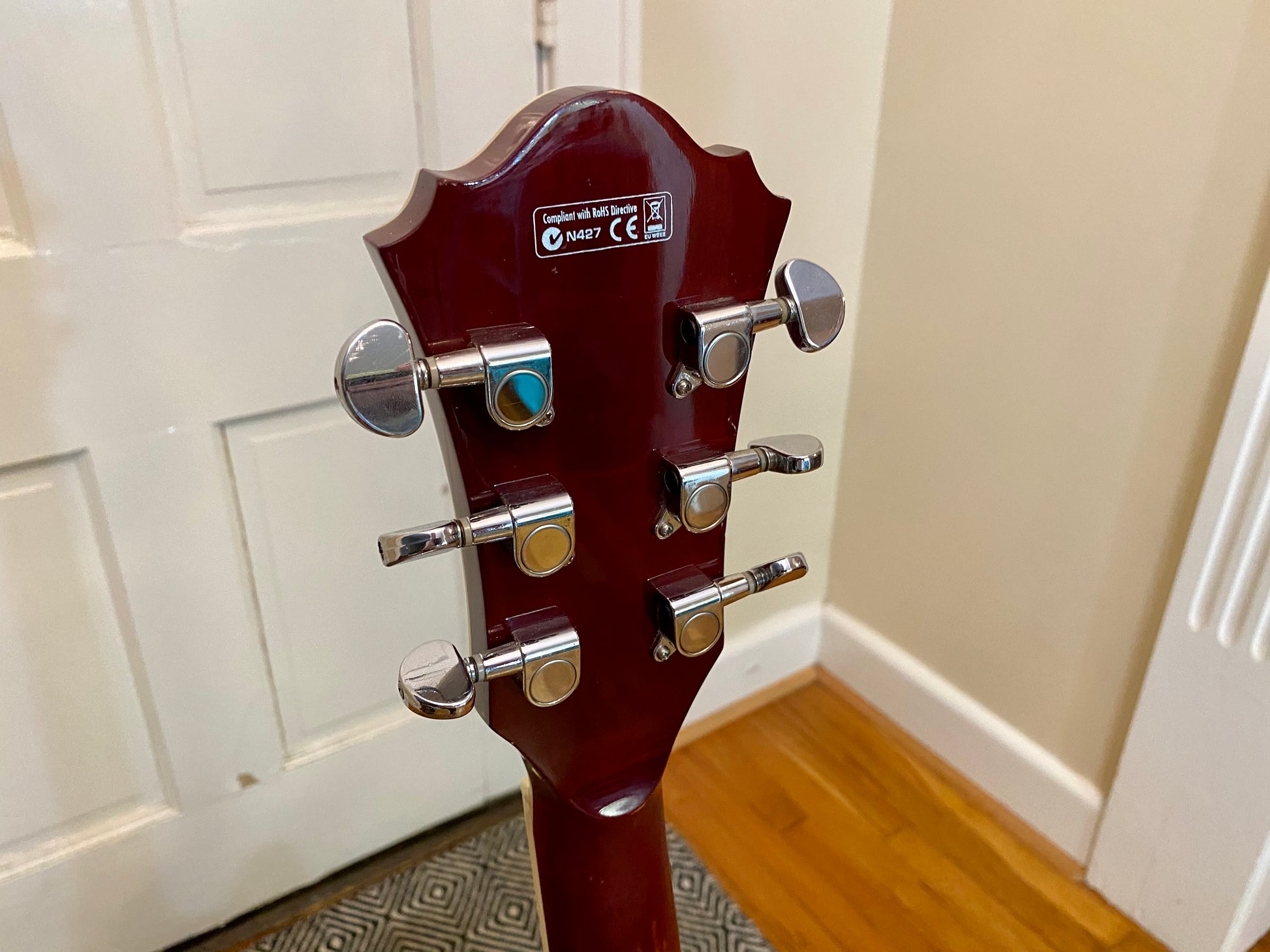Here's a nice and clean 2009 Ibanez Artcore AS73 finished in a translucent deep burgundy with cream binding.