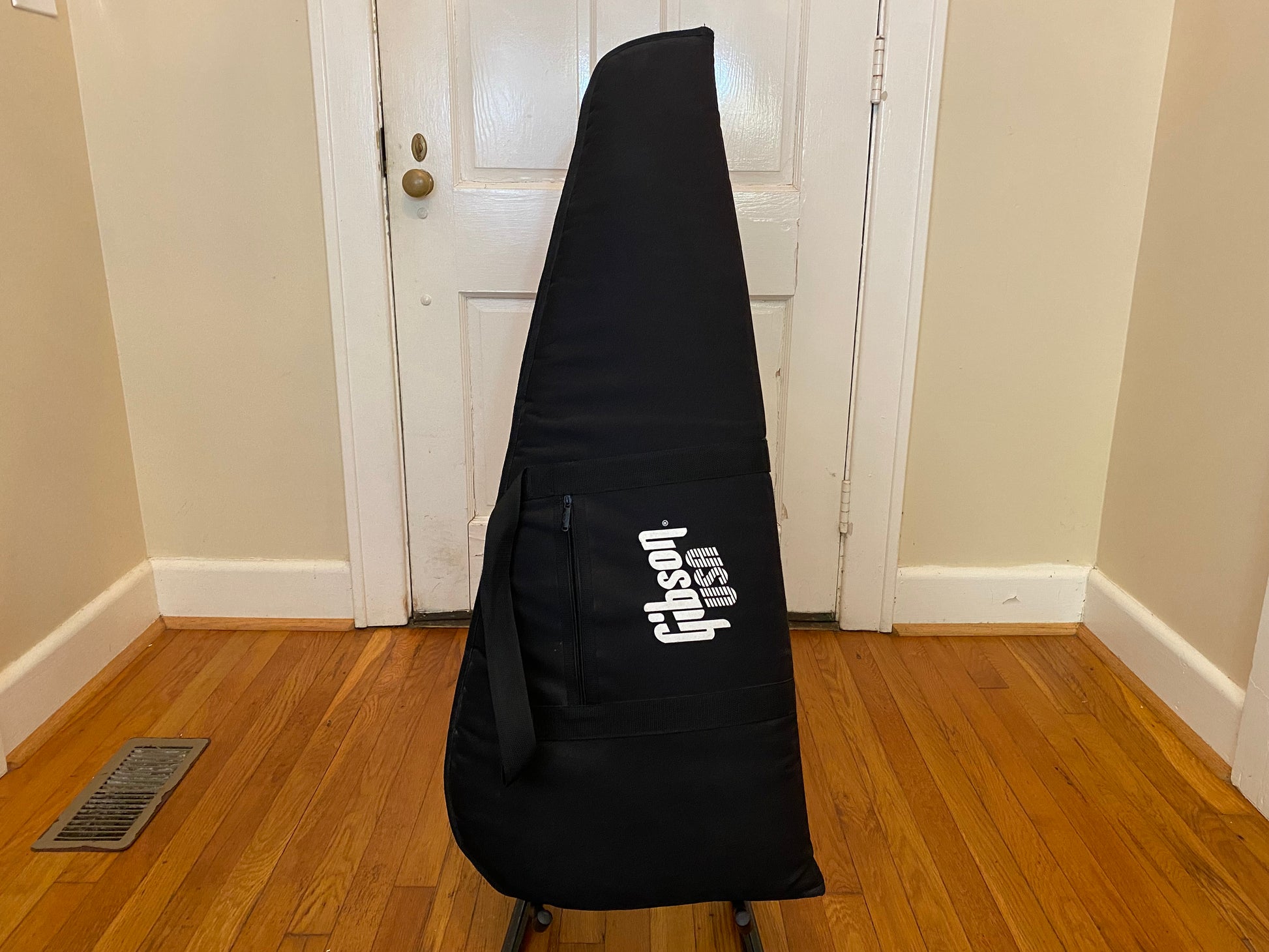 Two minor cosmetic modifications are the aftermarket truss rod cover (same mounting hole footprint as original) and the reflector style knobs labeled "Volume" and "Tone". Comes complete with a Gibson "Wedge" style gigbag that is also in great shape.