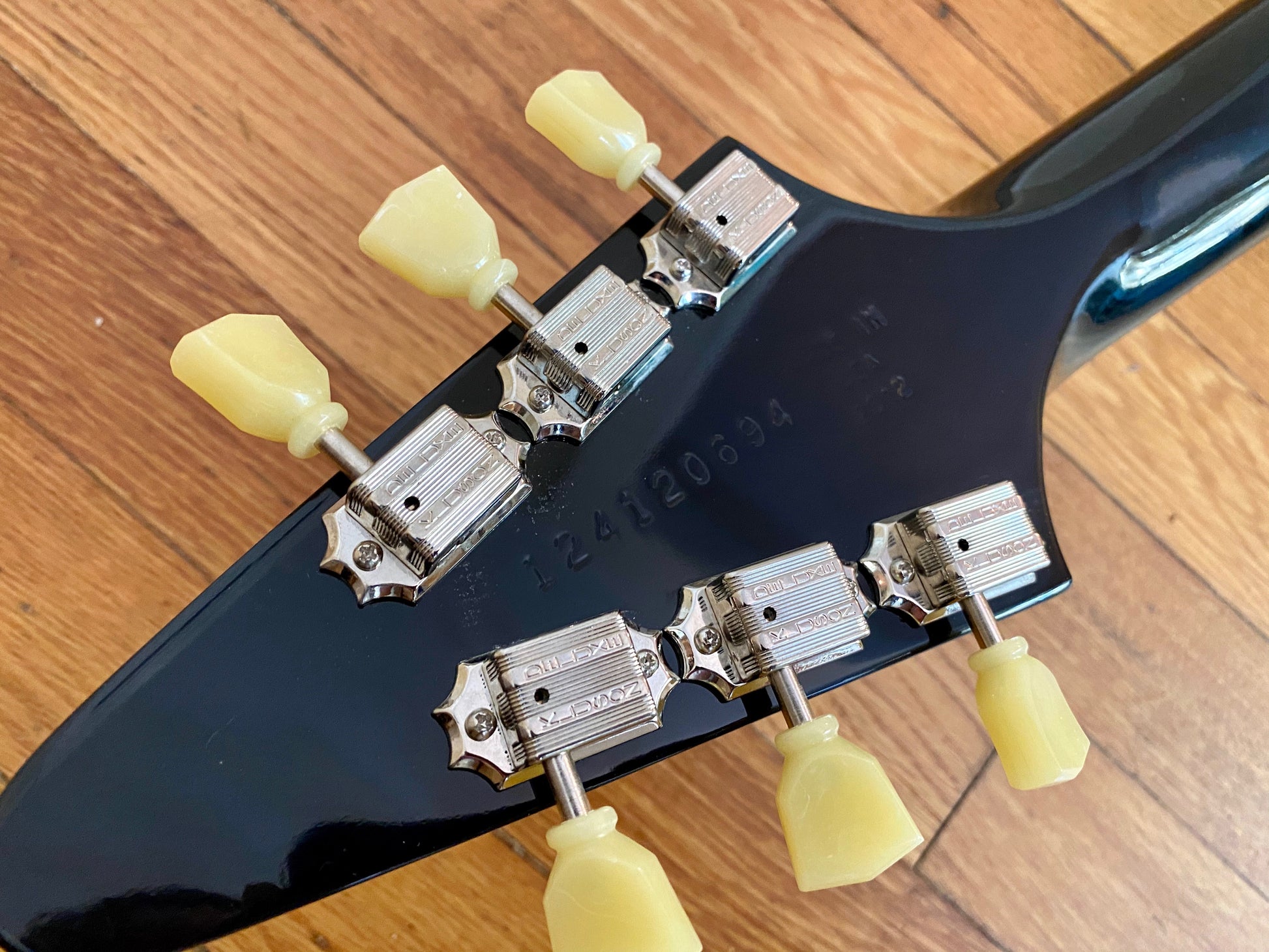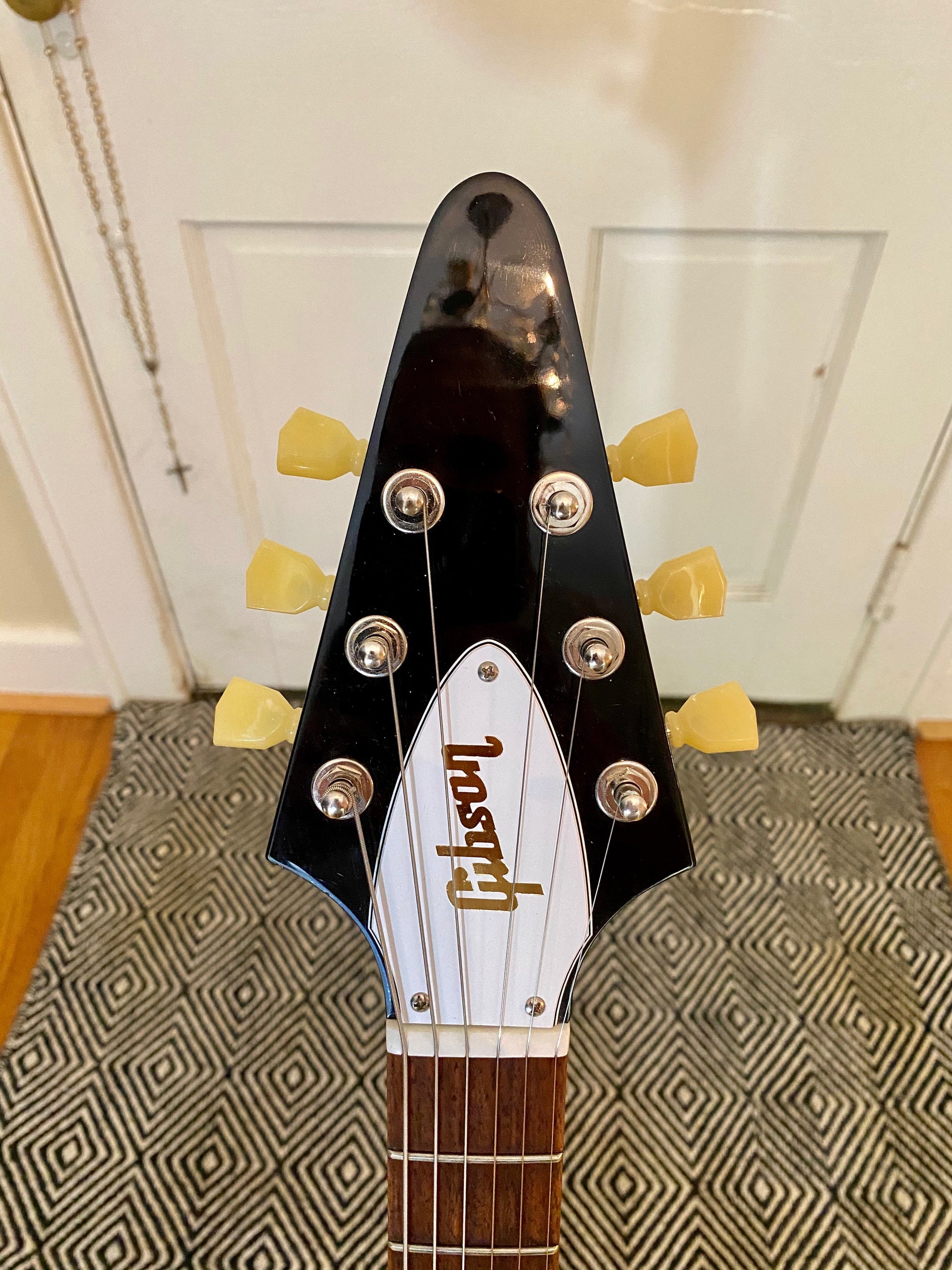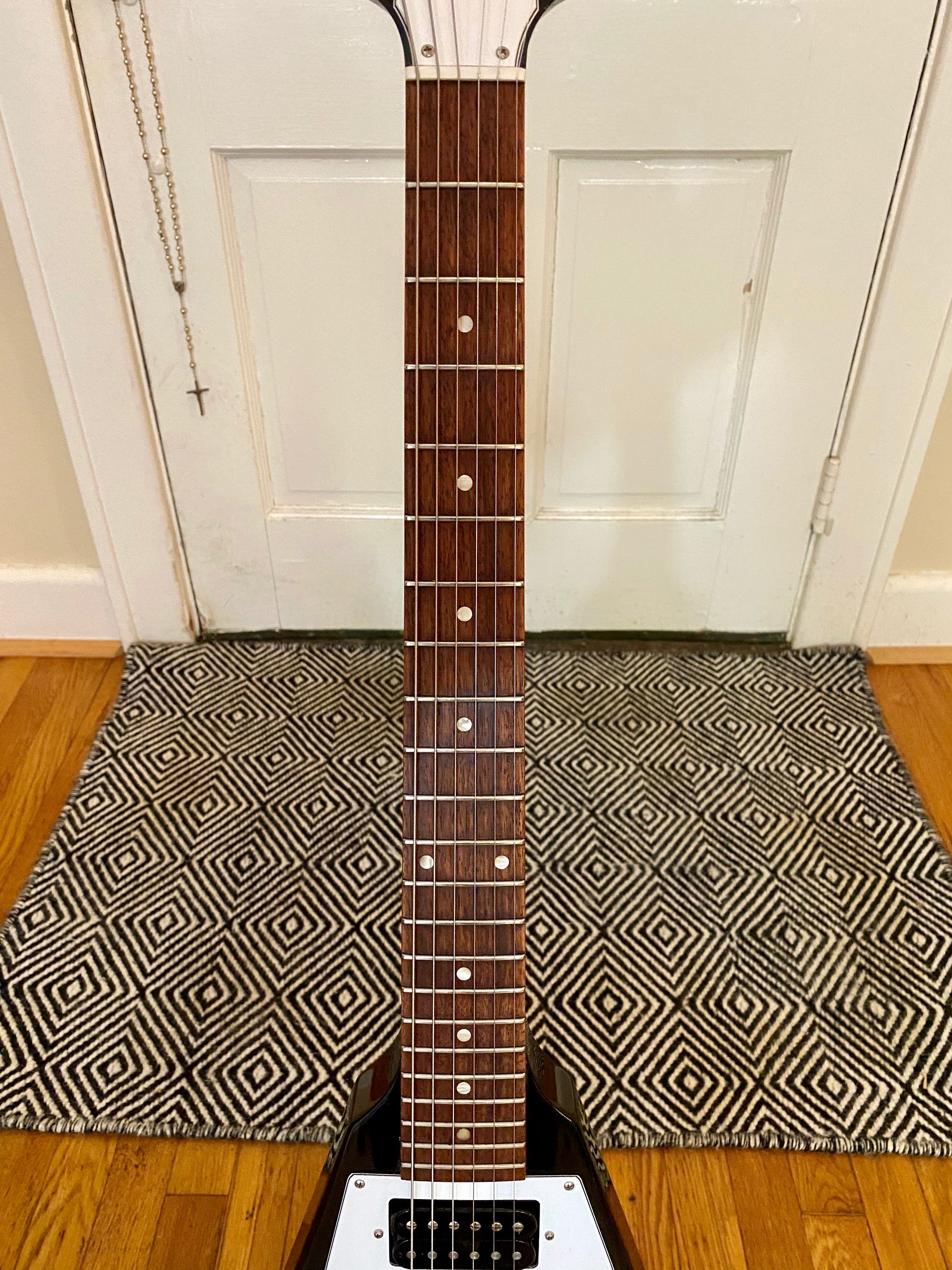 Here's a very nice and clean 2012 Gibson USA '67 Reissue Flying V finished in a Gloss Ebony with a white 3-ply pickguard for that classic Tuxedo look. All original condition with 496R/500T pickups - all electronics function properly without any static or scratching. The neck has a great feel. It is straight and the truss rod functions properly. The frets are in fantastic shape and show virtually zero wear.