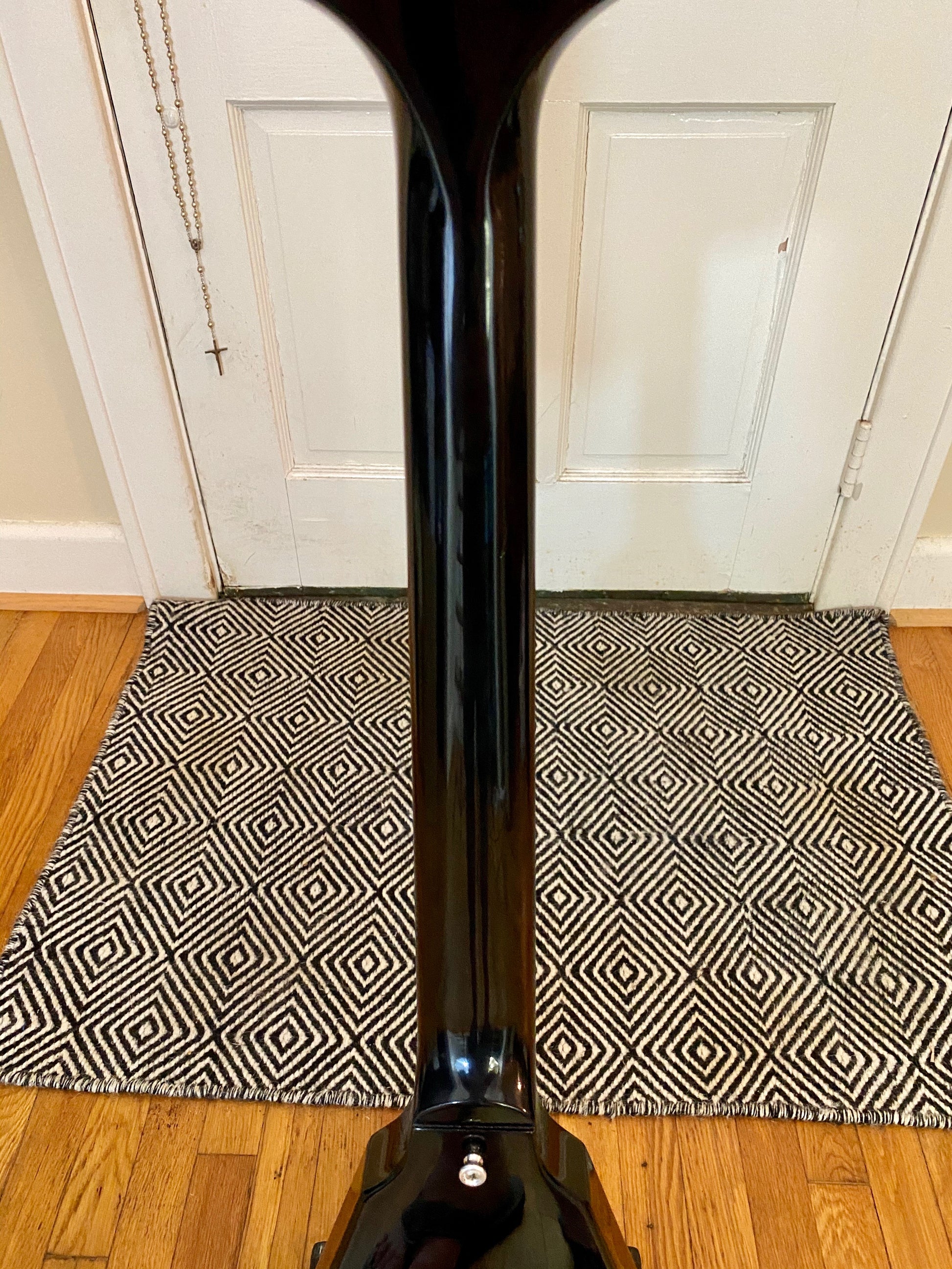 The Ebony gloss finish shows very well - as with most any black finish, each little blemish is visible. Shows very light playing wear on the top and back, and a few minor button scratches on the back. All the corners and edges look great.