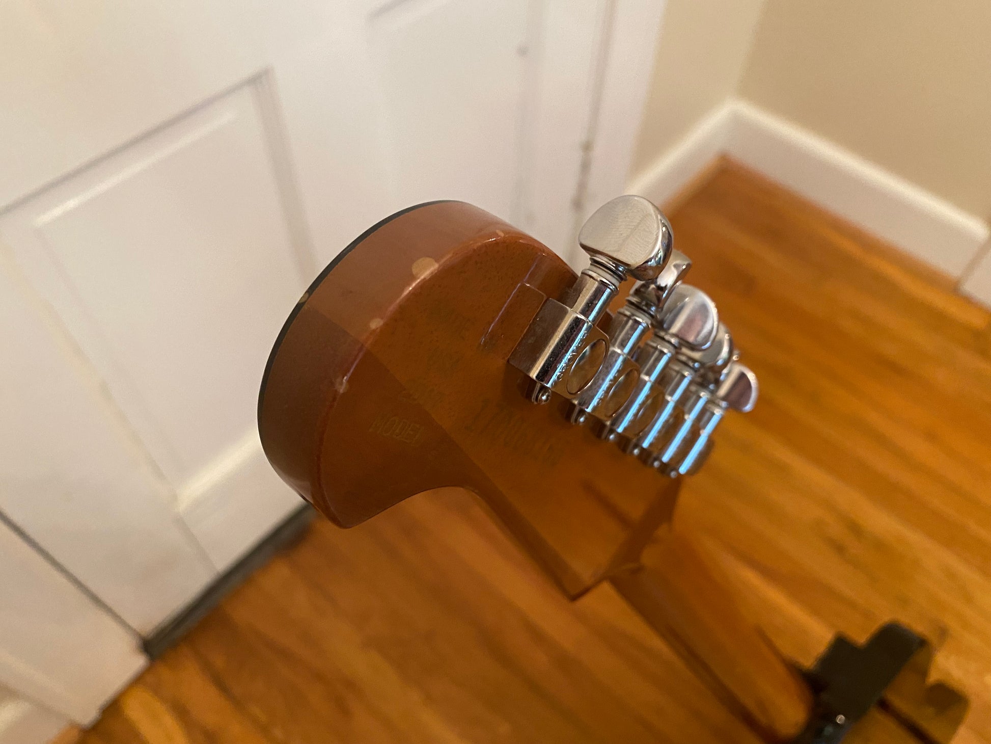 The guitar plays fantastic after a fresh setup. The neck is straight and truss rod functions properly. The frets have been polished (no leveling required) and the fret board has been cleaned and conditioned. The action is low and comfortable and the intonation has been set.