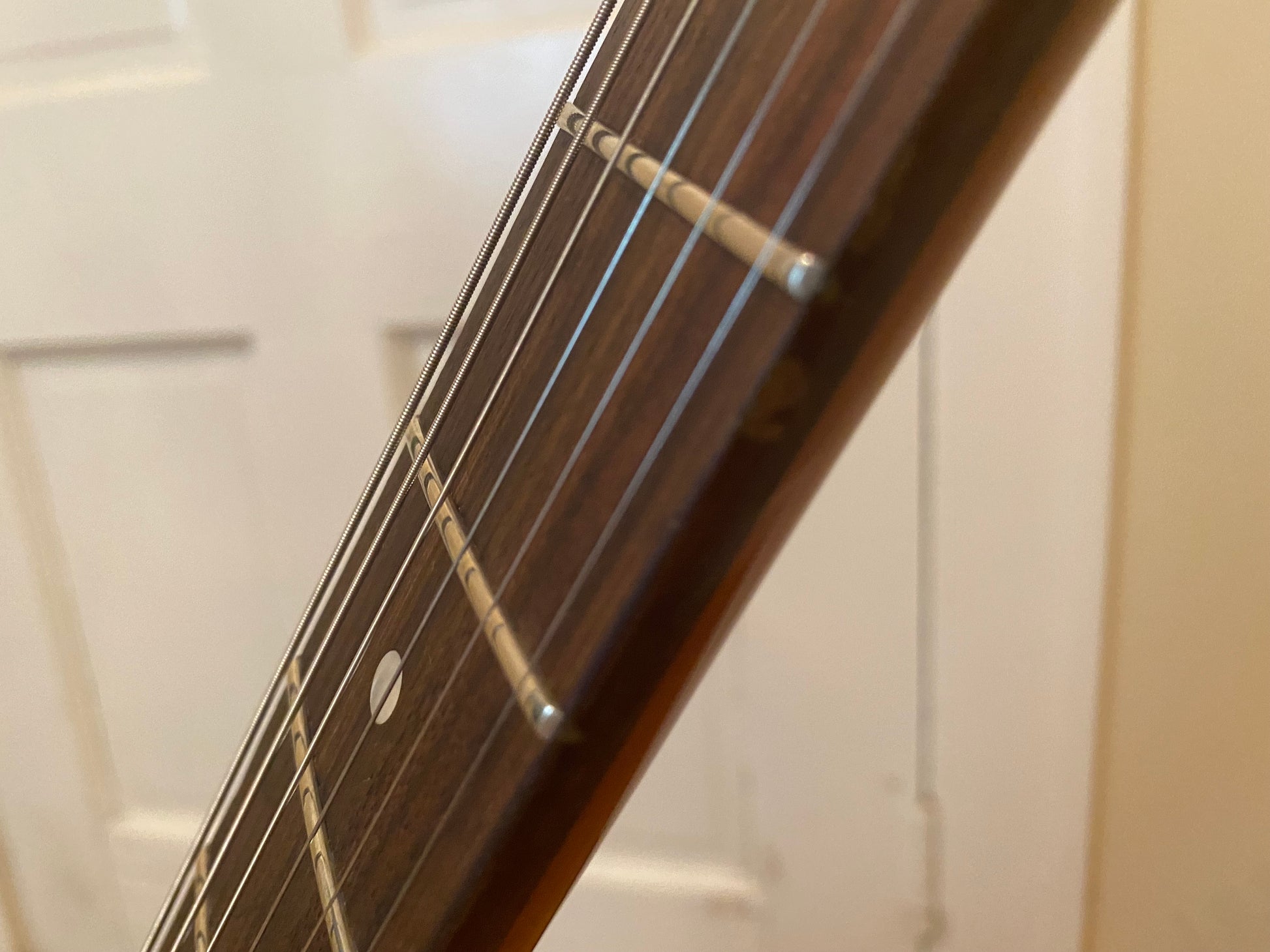 Overall great shape showing just a few minor wear items. Minor light playing wear all over. There is some finish chipping on the treble side of the fretboard - one larger section from frets 14 to 16 and a few other smaller spots. There is also an ultra shallow ding on the back of the neck that is clearly pictured and isn't noticeable while playing. All of these items are cosmetic and certainly do not affect the tone or playability.
