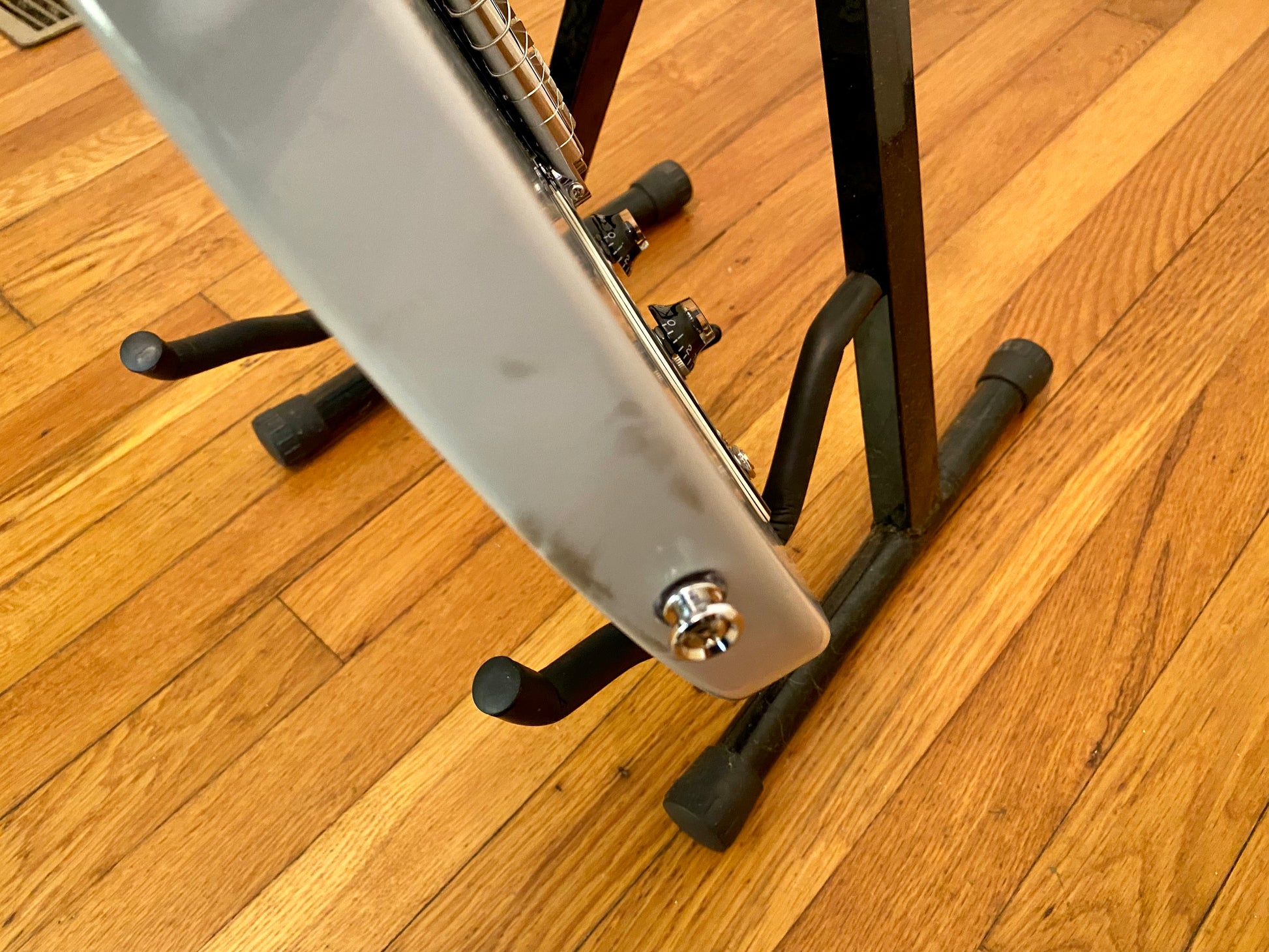 Does show minor strap wear around the buttons. This is common with such a thin nitrocellulose finish the butt end looks worse in pictures than in person.