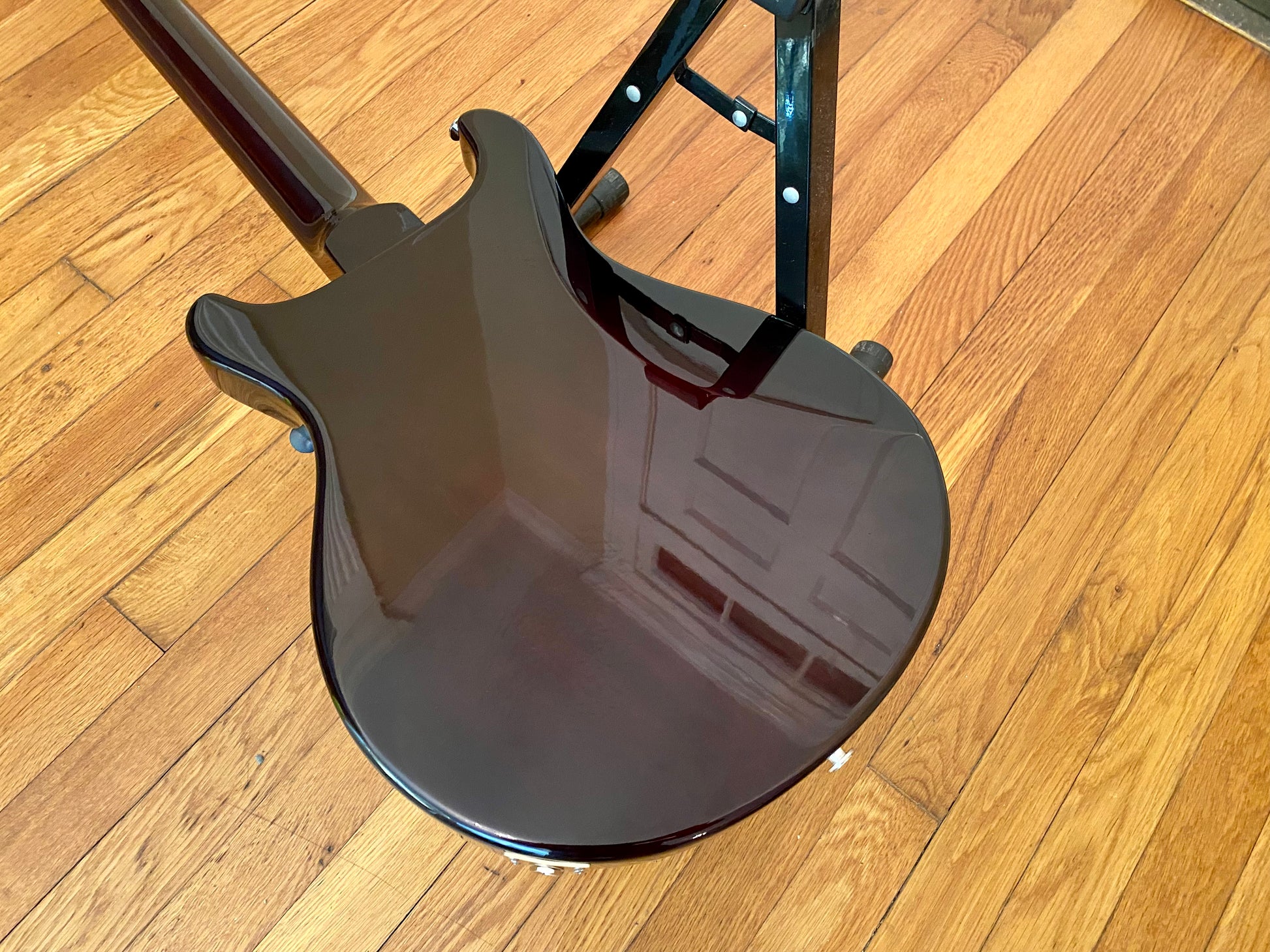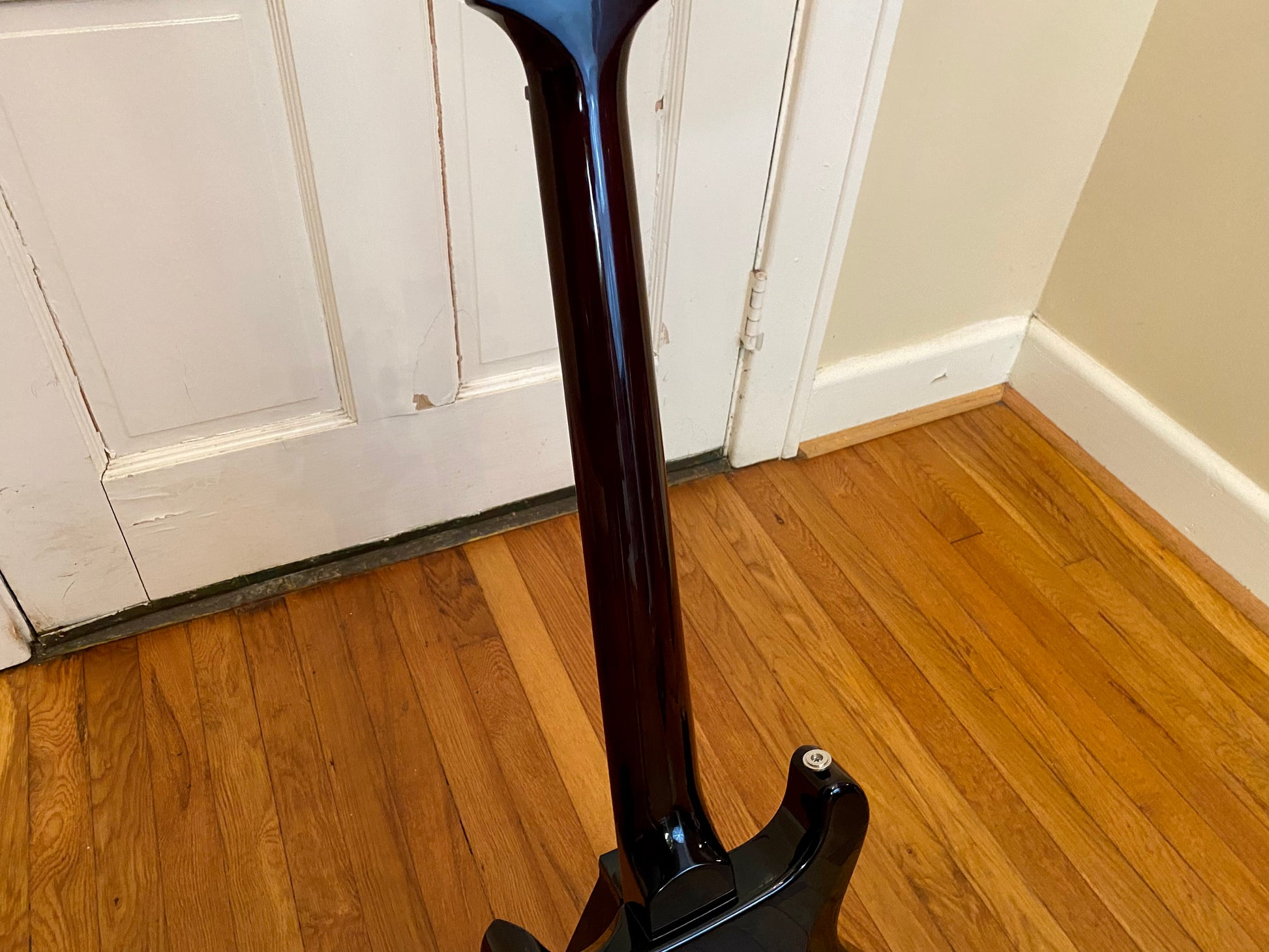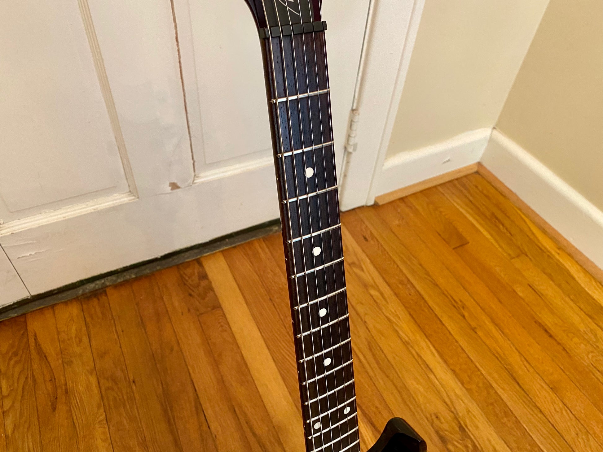 The neck is straight and the truss rod functions properly. The frets and and been cleaned/polished and feel fantastic - very fast and comfortable. The action is low and comfortable and the intonation has been set.