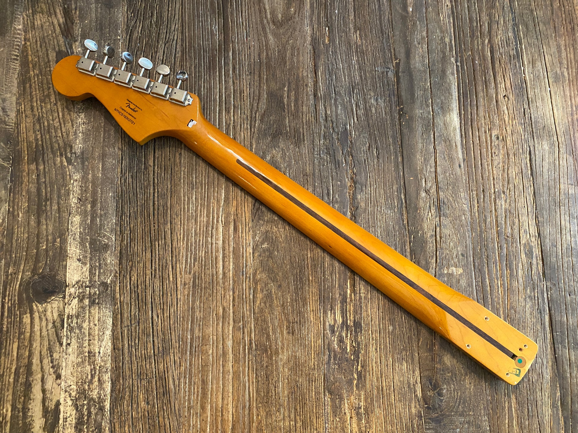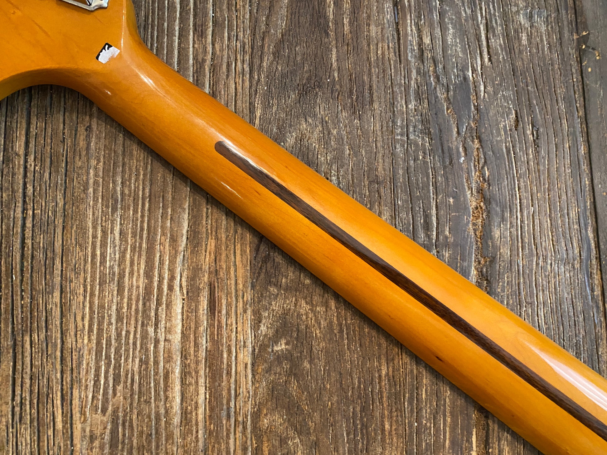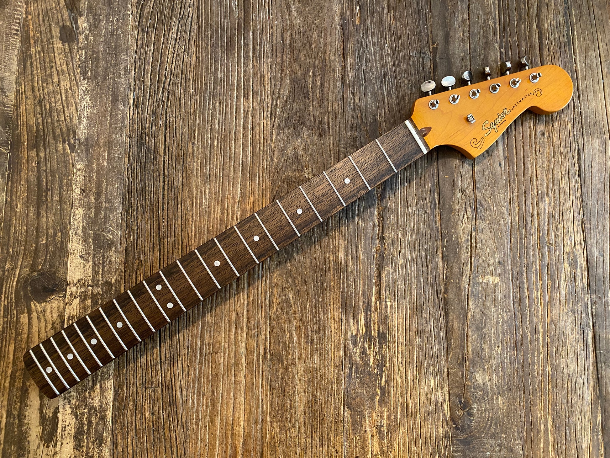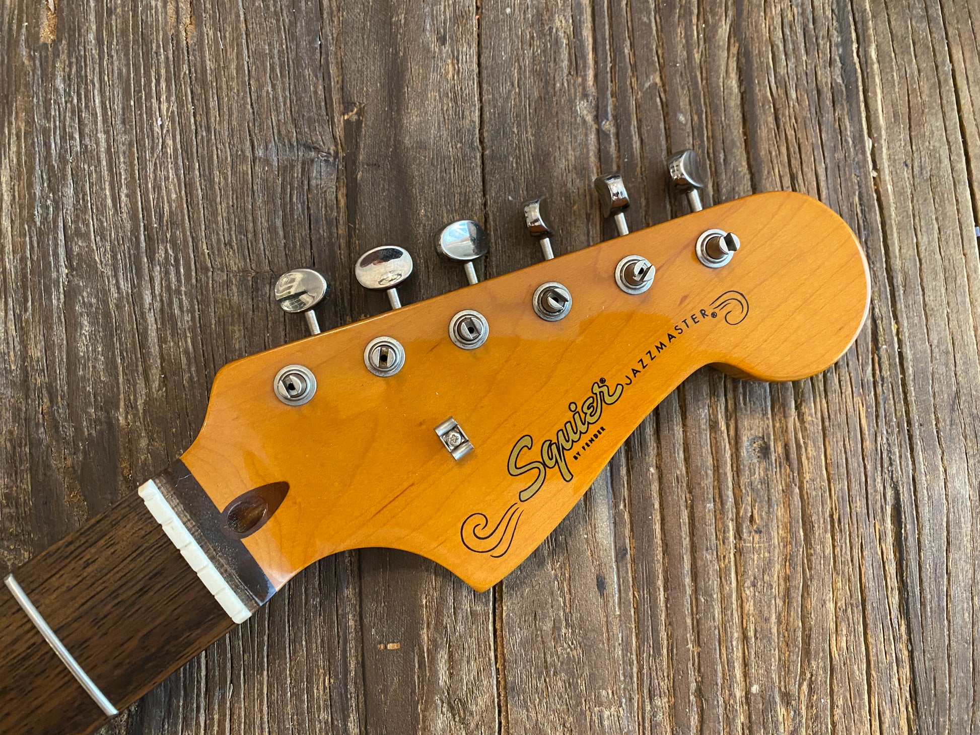Here's a very nice and clean neck complete with tuners from a 2019 Squier Classic Vibe Jazzmaster. The neck is maple with "Vintage Tint" gloss finish. The tuner are the original vintage style split post tuners. No notable blemishes and only some ultra light fret wear. The neck itself is straight and the truss rod functions properly.