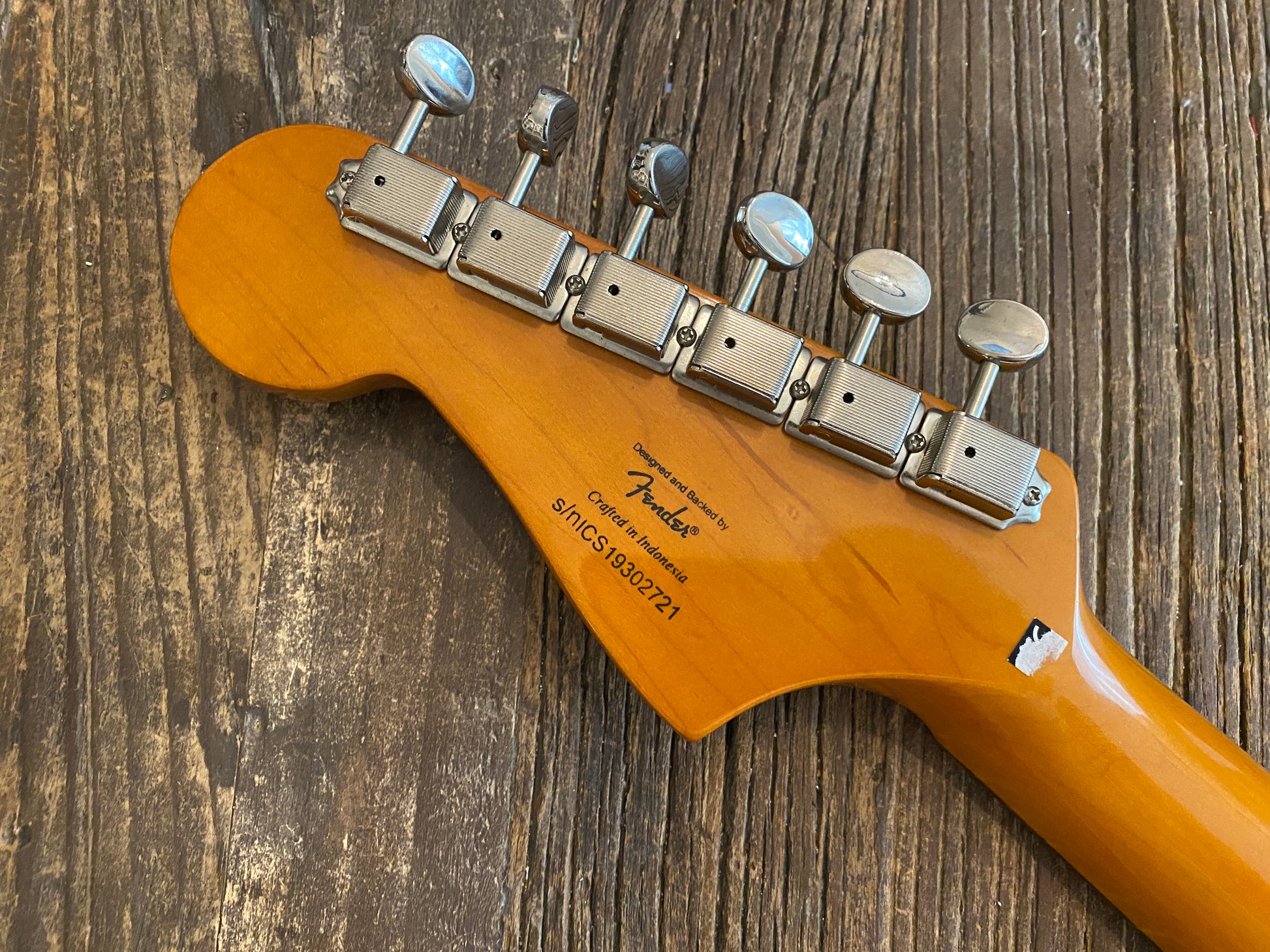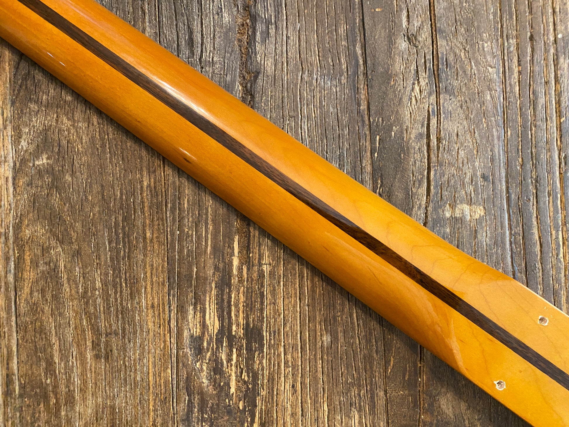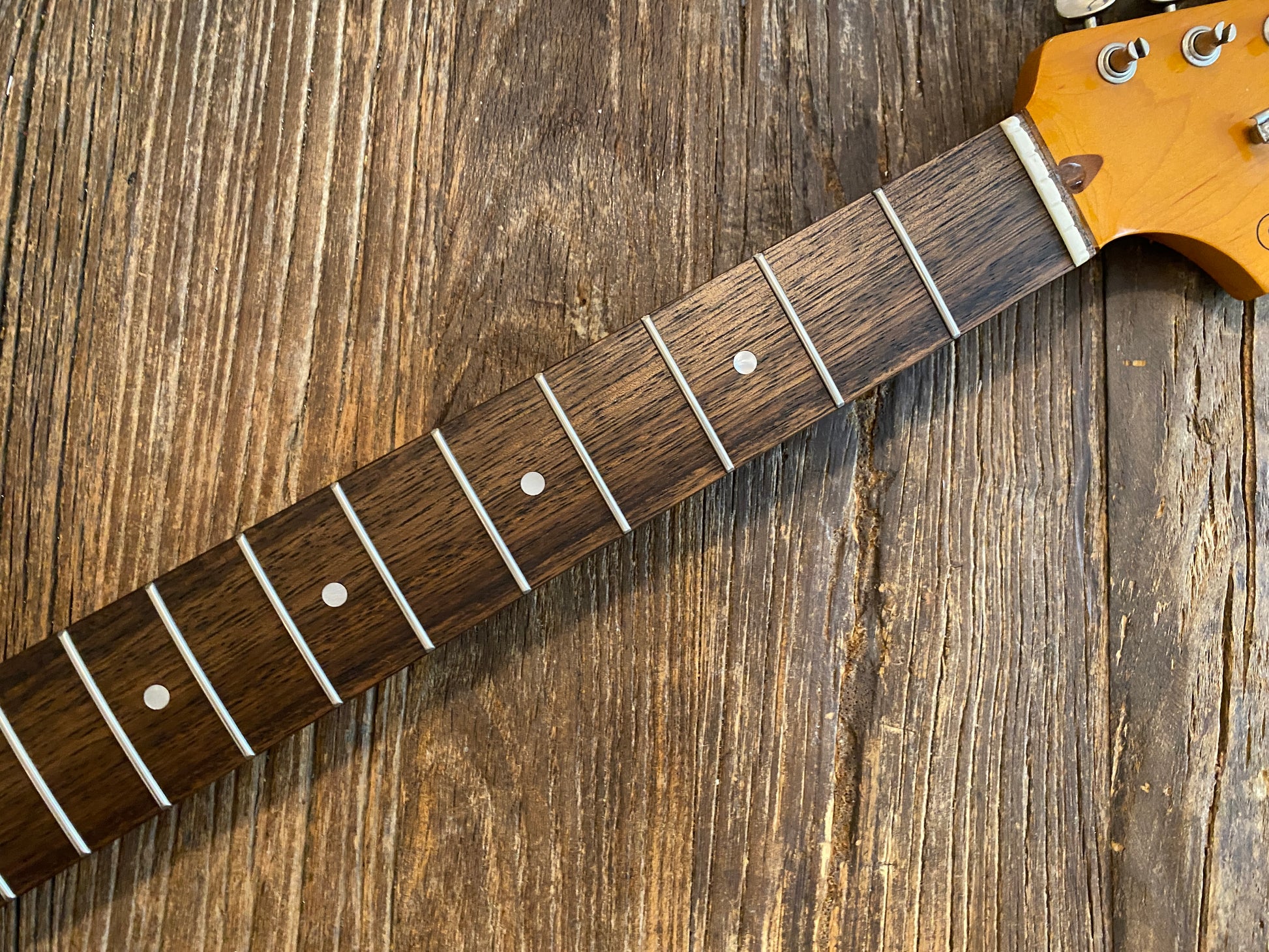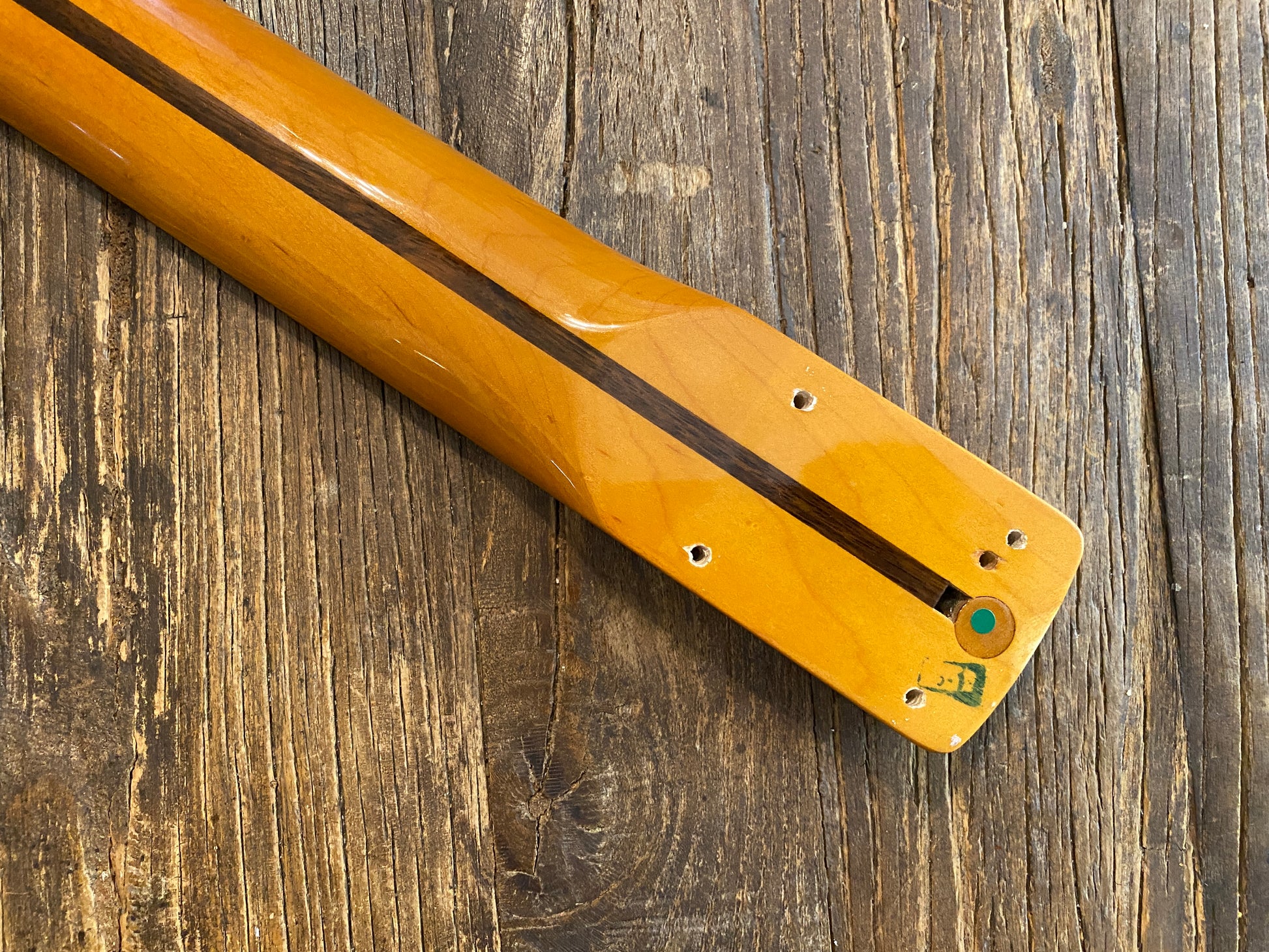 Here's a very nice and clean neck complete with tuners from a 2019 Squier Classic Vibe Jazzmaster. The neck is maple with "Vintage Tint" gloss finish. The tuner are the original vintage style split post tuners. No notable blemishes and only some ultra light fret wear. The neck itself is straight and the truss rod functions properly.