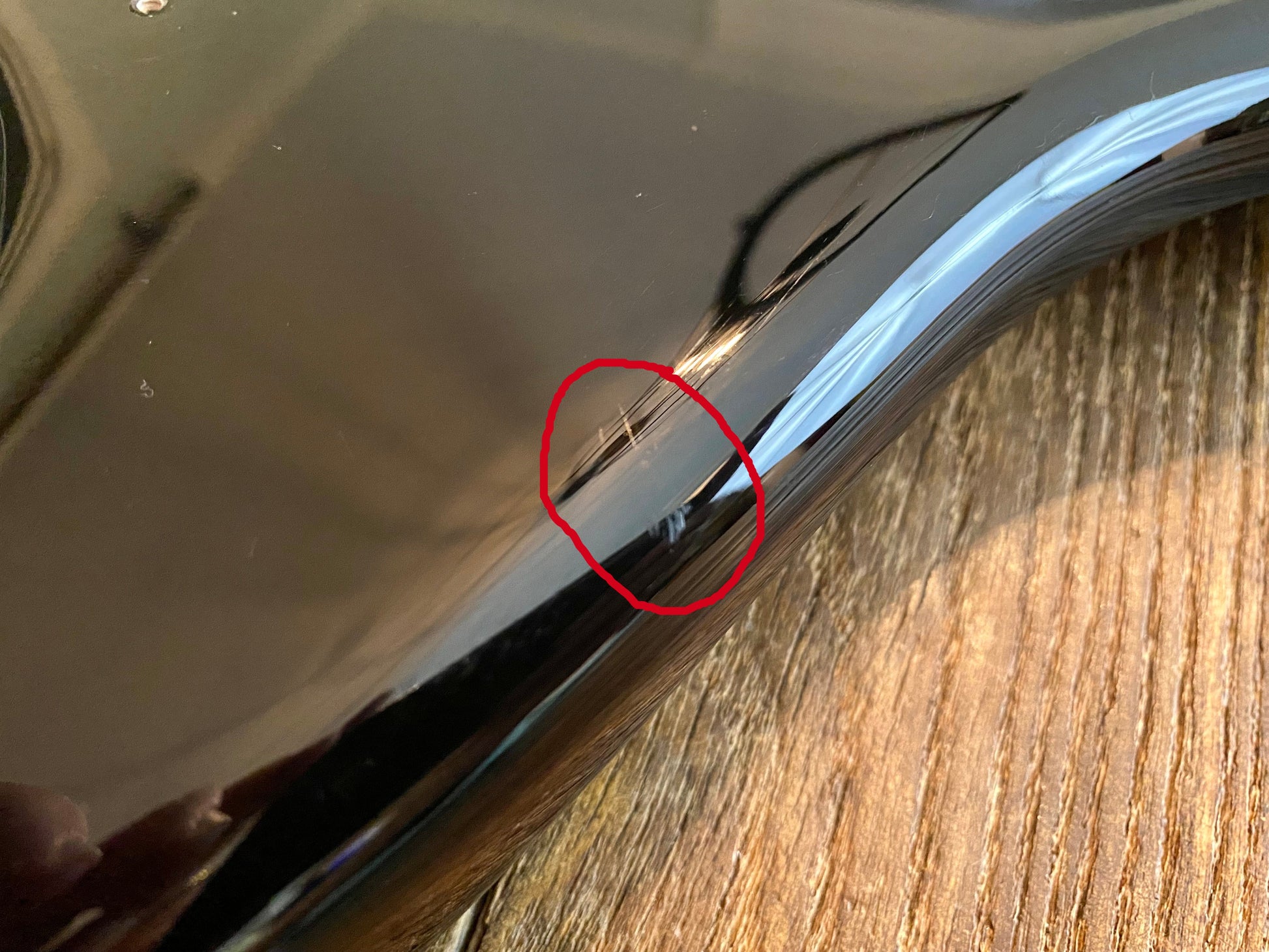 Nearly pristine with the exception of one very small blemish on the front edge near the belly carve and upper cut-away (pictured / circled below). It is so minor that if wouldn't be worth mentioning if they rest of the body wasn't in such good shape.