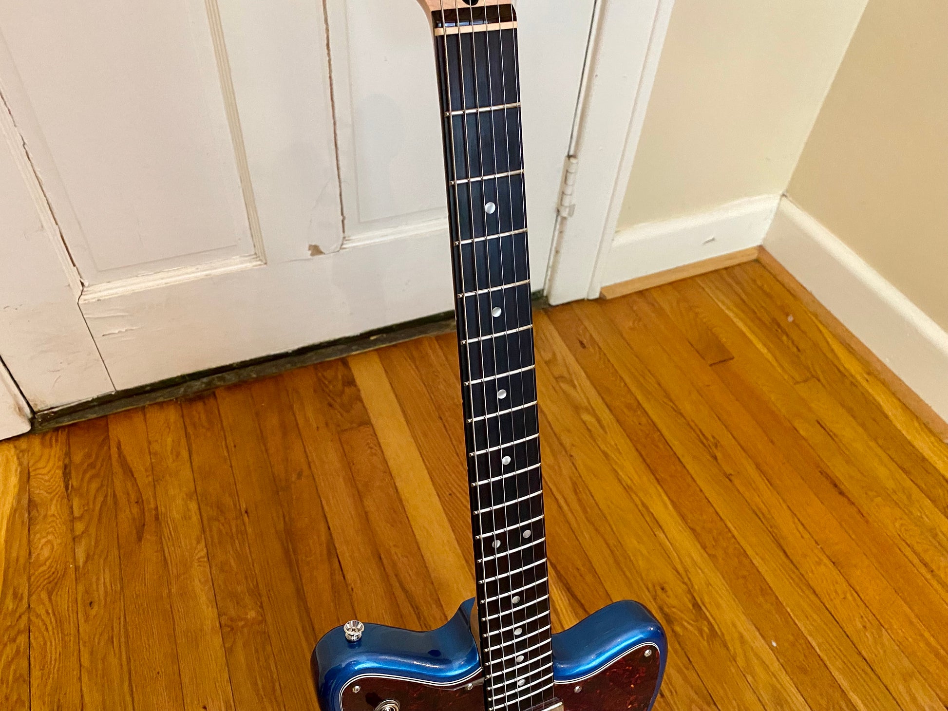 Here's an exceptionally nice and clean 2020 Squier by Fender Paranormal Series Toronado finished in Lake Placid Blue that has been painstakingly tastefully modified with top quality components.