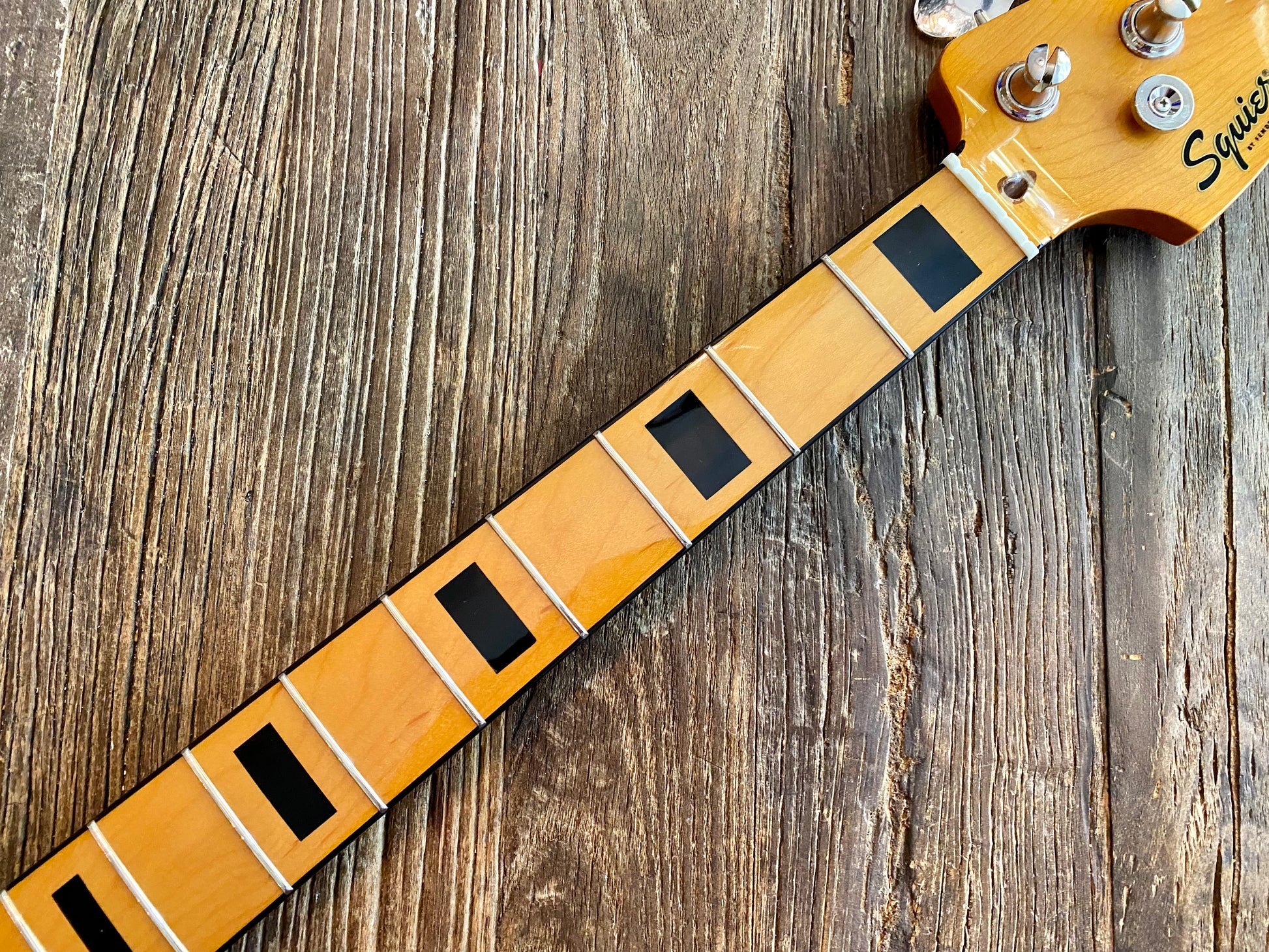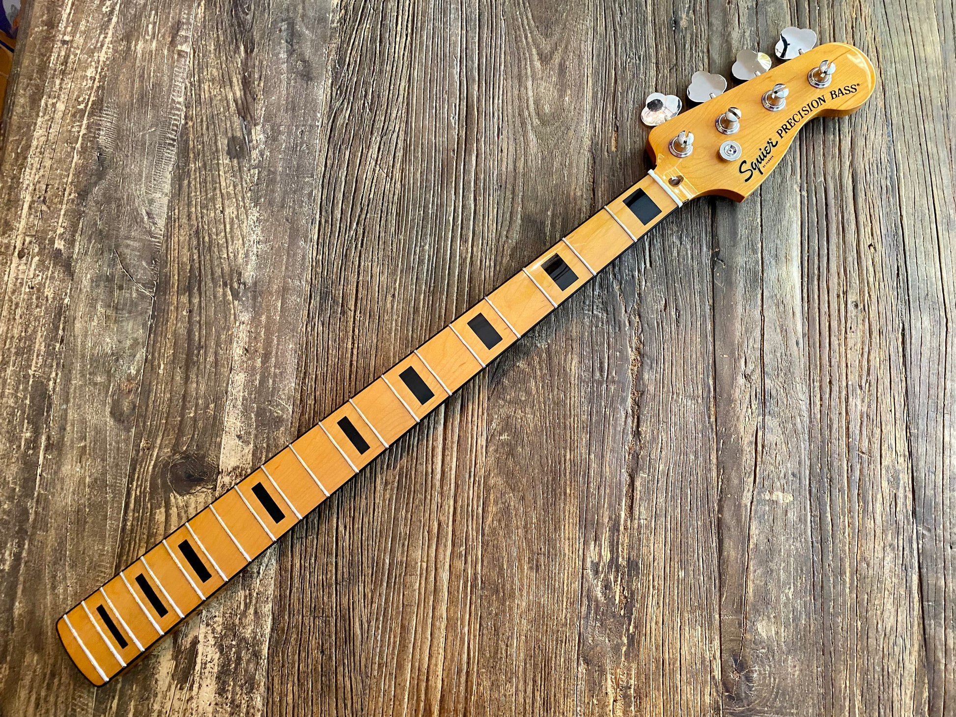 Here's a super nice and clean 2021 Squier Classic Vibe 70s Precision Bass Neck complete with the original tuners. The black binding and block inlays do a lot to dress up what is otherwise a commonly featured neck. Fantastic condition overall with the "vintage tint" gloss finish. The frets are in great shape overall showing only minimal wear on the first few frets. No other notable wear and ready to finish off you next project.