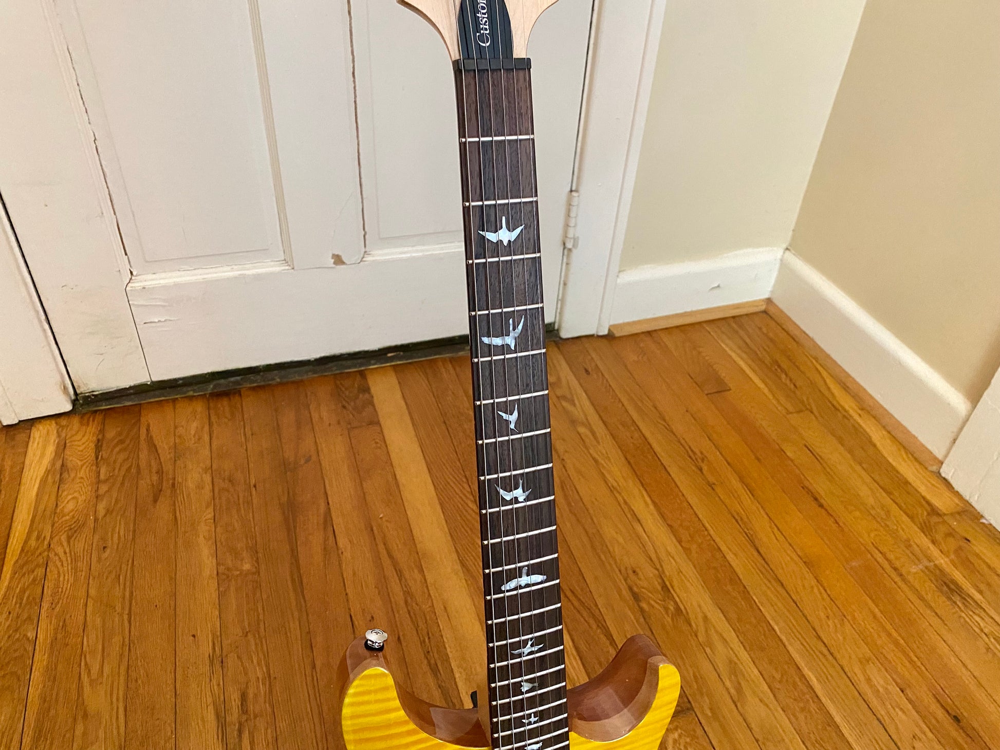 Here's an exceptionally clean 2021 PRS SE Custom 22 Semi-Hollow finished in the original Santana Yellow. The frets show virtually zero wear, the neck is straight, and the truss rod functions properly. This guitar plays and sounds fantastic with a little help from the upgraded electronics allowing for a total of 14 different tones.