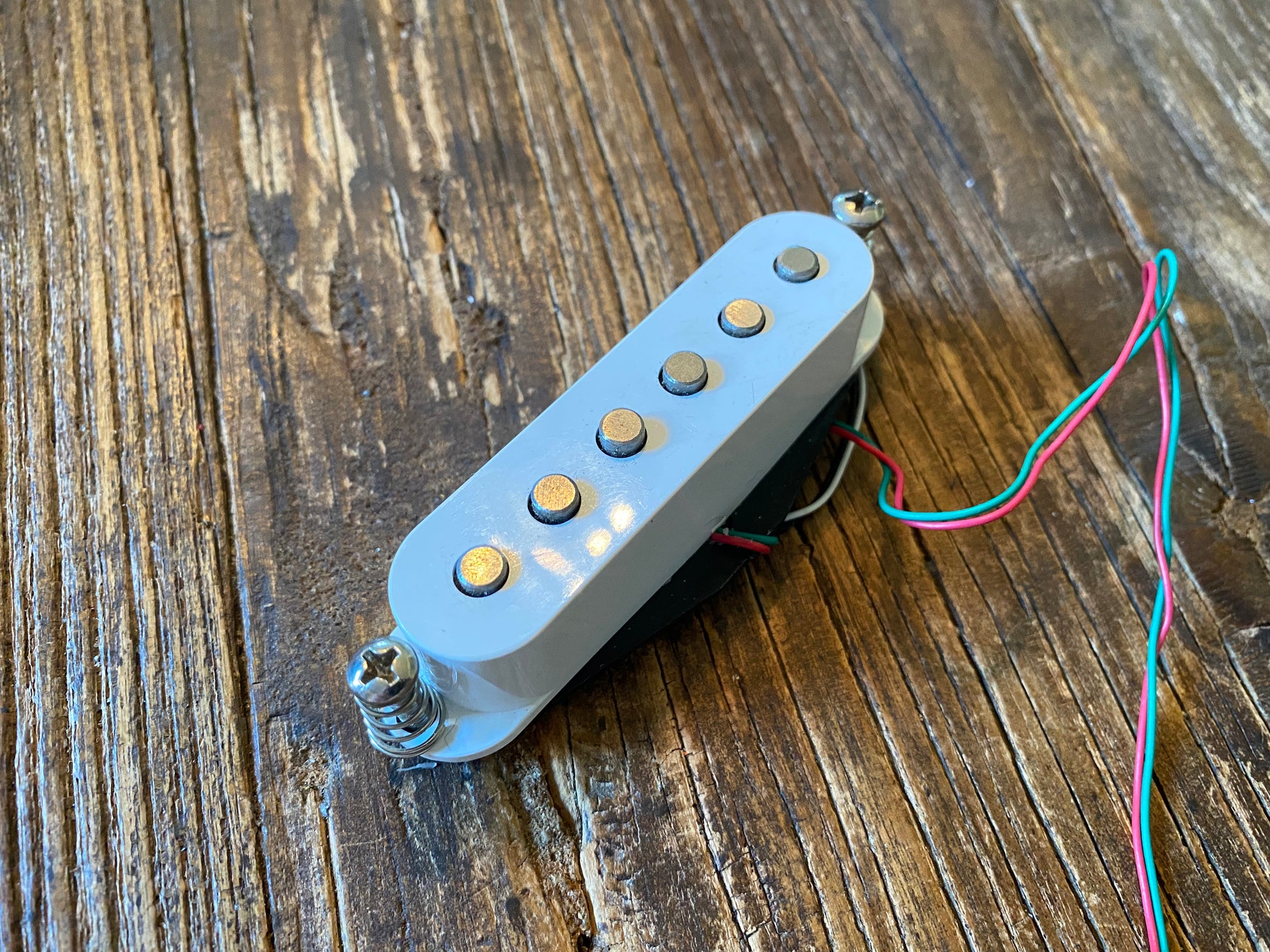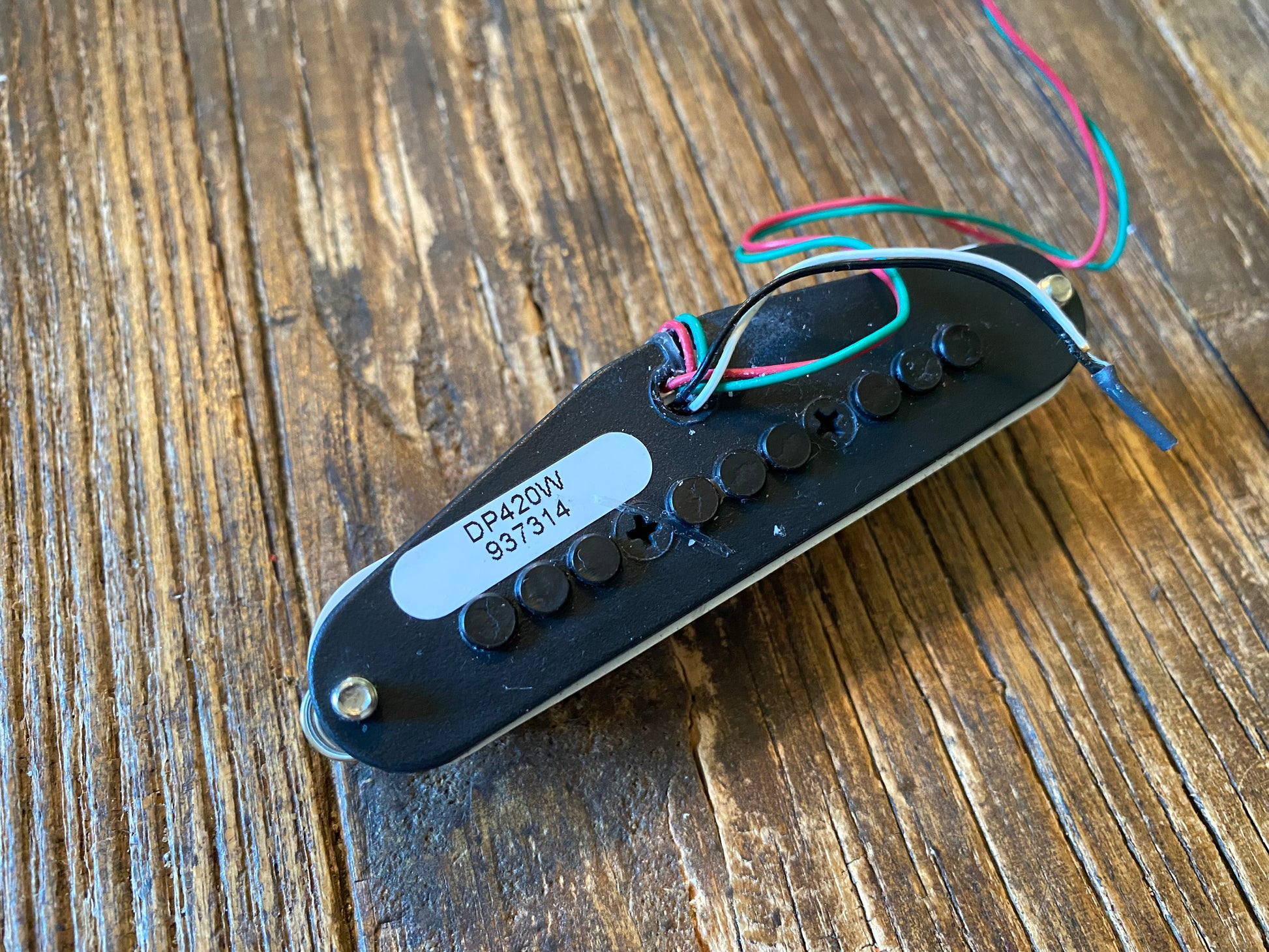 Here's a super nice and clean DiMarzio DP420W Virtual Solo Stacked Hum-Cancelling Single Coil for the bridge position. Leads are 10" in length and meters at 10.66 kΩ.
