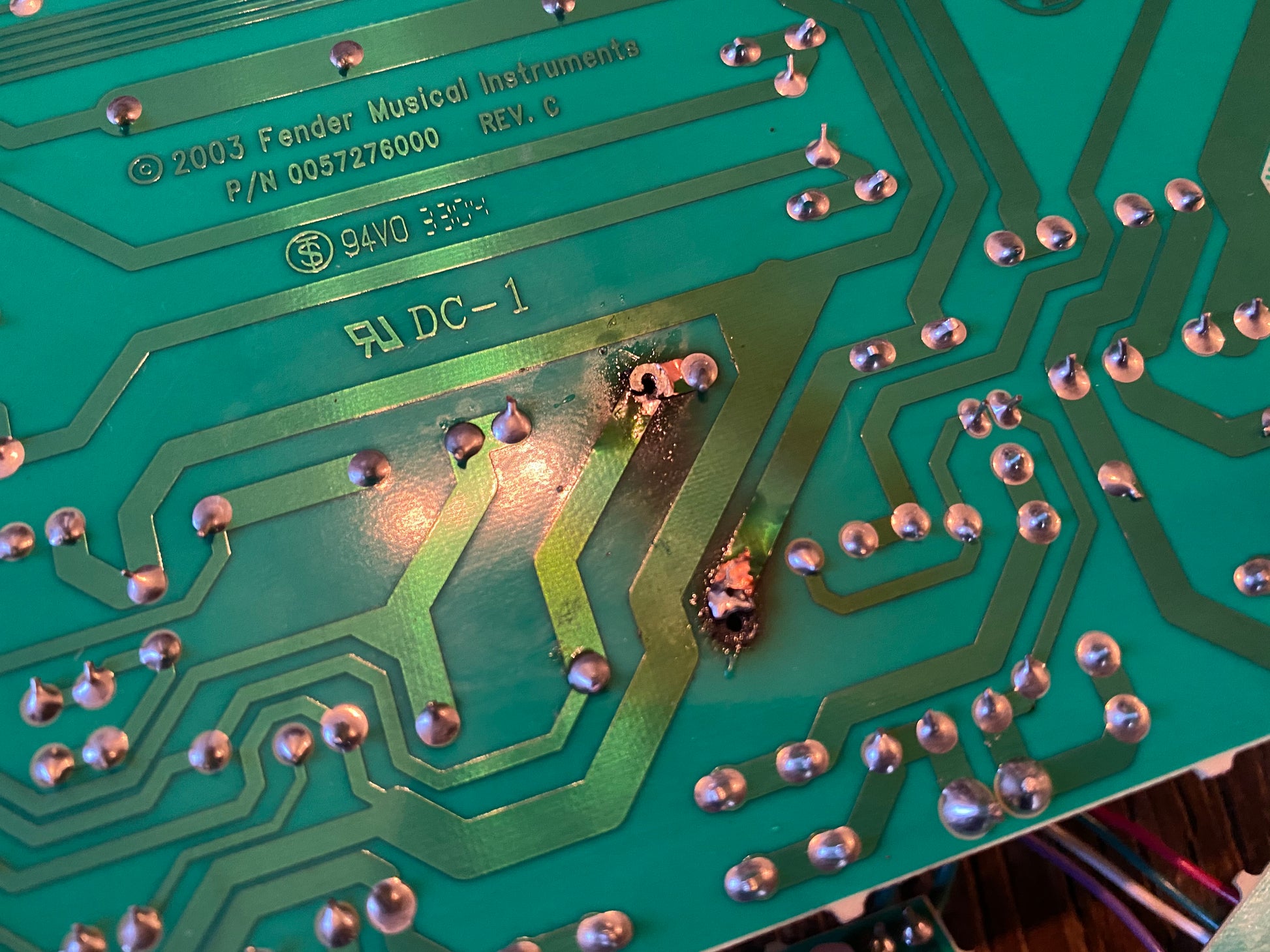 Here's a 2003 Fender Blues Junior printed circuit board from a 2003 labeled as "Rev C". This board is damaged and has burnt/lifting trace between B+ and B+1 (Screen Node) where the voltage dropping resistor is.