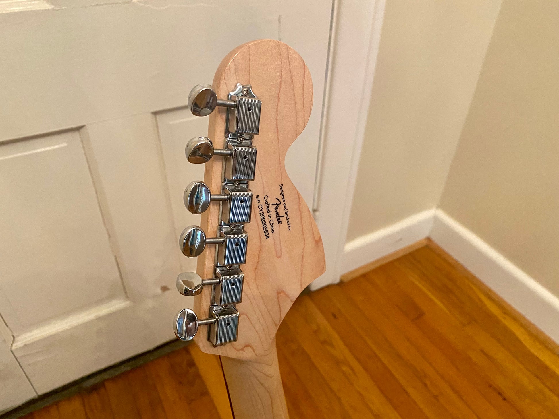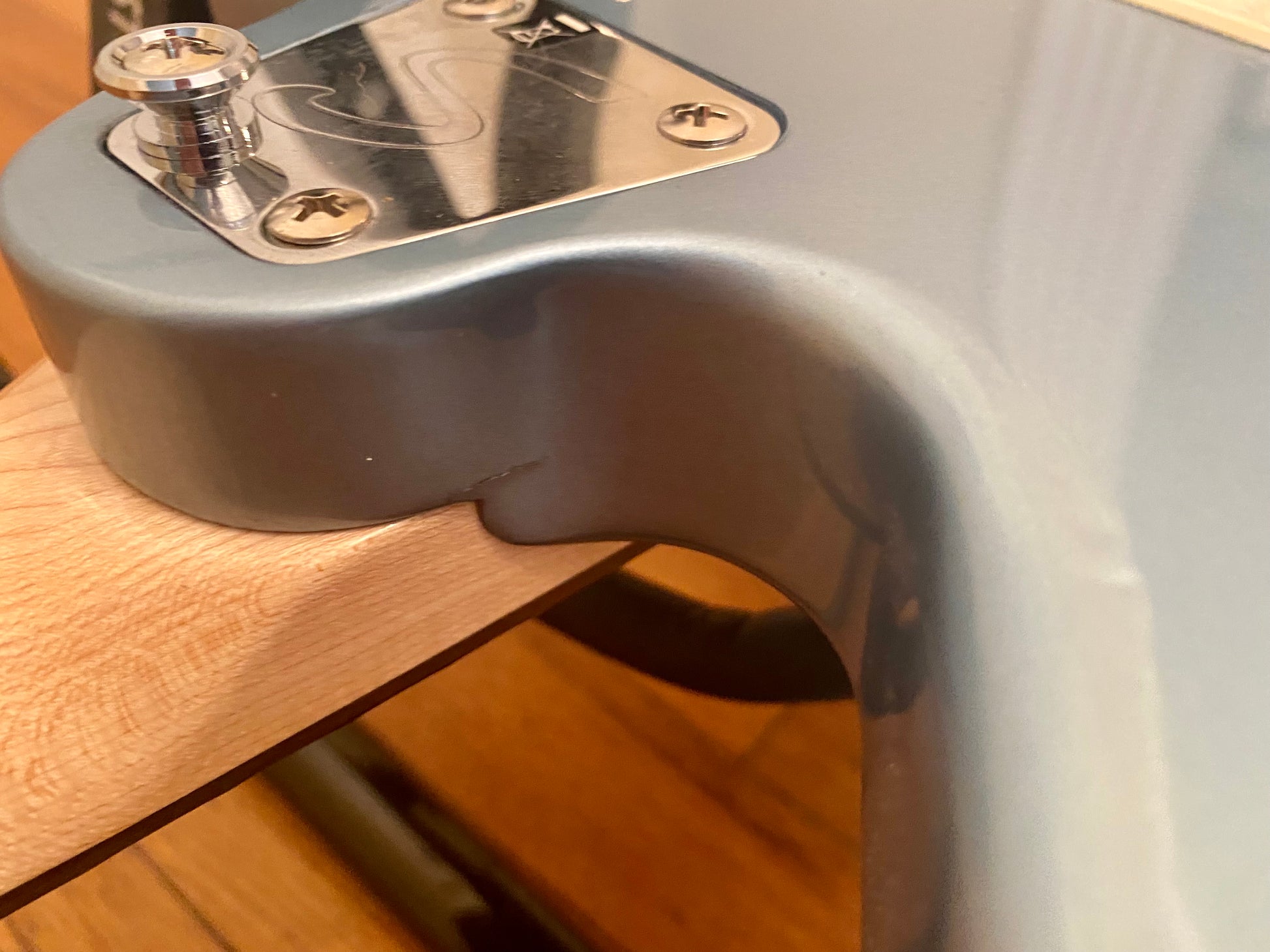 This guitar plays and sounds great and has been set up with 11-49 D'Addarios which is perfect for the shorter scale length. There is one minor stress crack in the finish on the treble side of the neck pocket (clearly pictured). Comes complete with a Fender Deluxe Padded Gig Bag.
